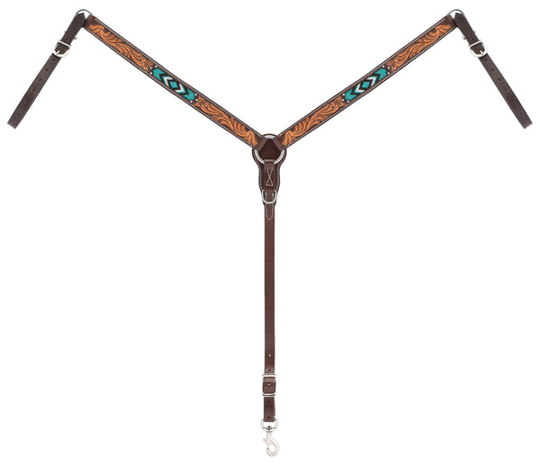 - Q: What decorative features does this breast collar have? A: This breast collar features intricate carved floral accents highlighted with tan stain and turquoise diamond beaded inlays.