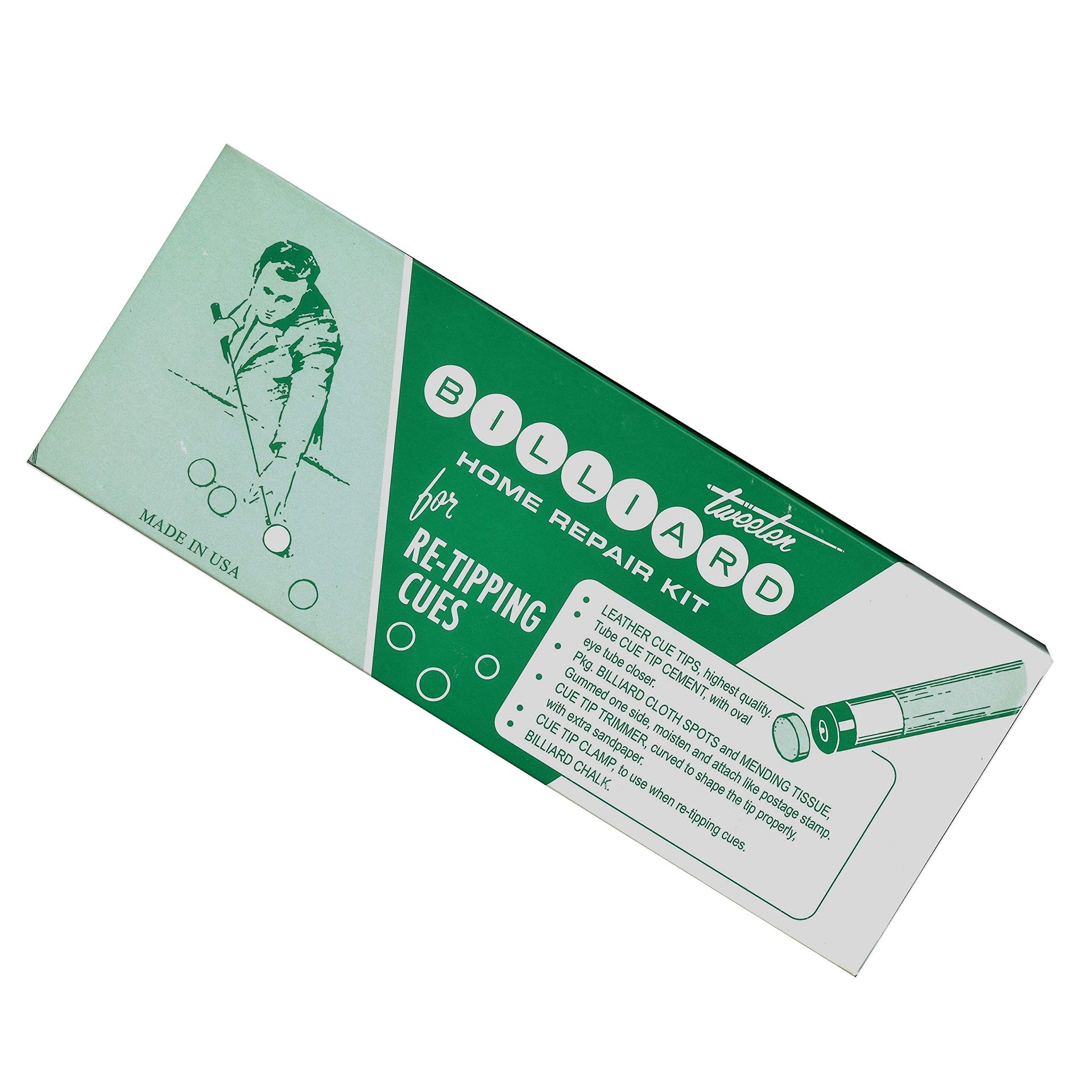 TRTK Features: -Tip repair includes: 10min cement 20gm tube. -Tip repair includes: 3 cubes of elk master chalk. -Tip repair includes: 12 assistant size elk master tips. -Tip repair includes: 1 tip clamp. -Tip repair includes: 1 tip sander with extra sand paper. -Tip repair includes: 1 cue top sander. Item: -Pool Cue Accessories. Country of Manufacture: -United States. Dimensions: Overall Product Weight: -0.5 lbs.