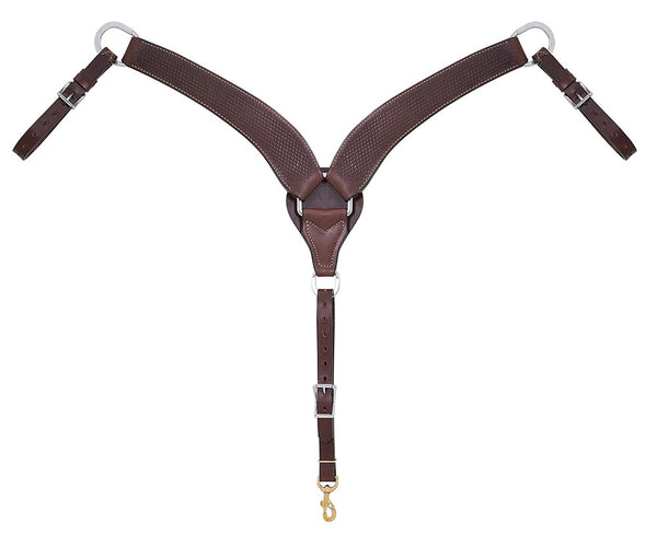From the vaqueros of yesteryear to the working cowboys of today, there has always been a heritage of fine horsemanship in the Great Basin region. We are paying homage to these skilled cowboys in the details and care put into this line of tack. This premium English bridle leather roper breast collar features an intricate stamped basketweave design, wheat-colored stitching and painted leather edges. Width tapers from 2-3/4'' to 2''. Stainless steel hardware (except snap is solid brass). Horse size. Made by Weaver.
