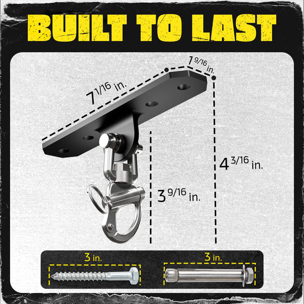 About us:Our brand is a top brand in the fitness industry, providing high-quality equipment for home and commercial gymsOur wall ceiling mount hook 360A Rotation is the ideal solution for your heavy bag mounting needsAbout product:-With a unique 360A rotation feature, this heavy bag mount provides stability and security during intense workouts-crafted with high-quality materials, the punching bag mounting bracket is made of Inox 316, providing excellent resistance to corrosion and oxidation-Our heavy-duty swing hanger set includes a hook and matching bolts that can be used for mounting on wood or concrete ceilings, supporting a capacity of up to 600 pounds Ideal for hammock hanging chairs, tree swing hanging kits, egg chair hanging kits, punching bag hangers, aerial yoga, gym-The innovative spring lock pin design allows for easy installation and disassembly, making it a versatile choice for indoor and outdoor use-The punching bag mounting bracket is an ideal solution for home gyms, commercial gyms, and health clubsInvest in the security, durability, and convenience of the wall ceiling mount hook 360A Rotation, the heavy bag mount that will provide a sturdy foundation for your intense workouts