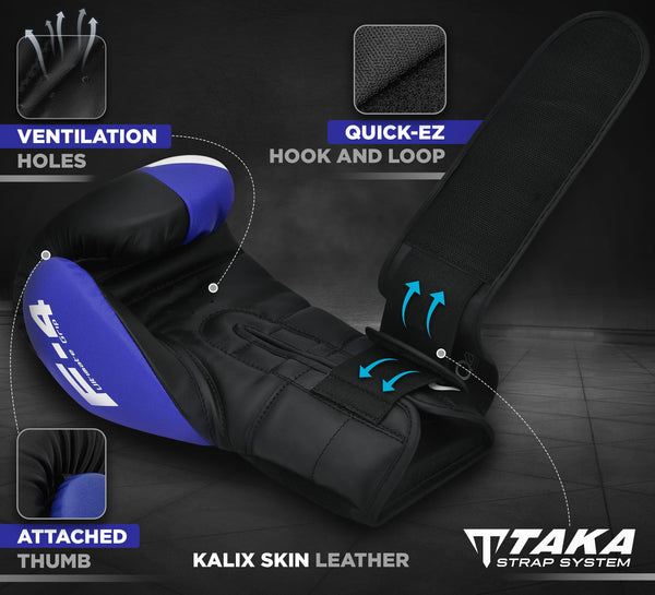 The high-performance boxing gloves by RDX are manufactured using Kalix Skin leather, which makes them resilient and durable in the face of prolonged training sessions of Muay Thai, Boxing, Kickboxing, and other similar sports With multiple layers of padding including Spongey Blacktop Fabric, Polygonal Fusion Foam, EVA-Lution Sheet, and gel Foam, the boxing training gloves can effectively diffuse the recoil impact of punches The hook-and-loop closure system of the gloves strap is supported by the unique TAKKA closure system which includes a small elasticated strap to adjust the gloves more easily The smart boxing gloves also have strategically placed SPP holes in the palm to minimize the accumulation of sweat during training sessions