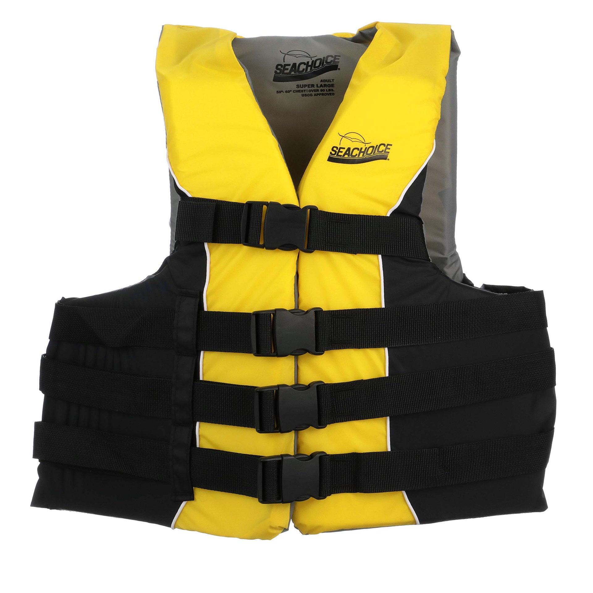 This vest has a 200-denier oxford fabric shell and is lined with foam material. This Ski Vest has four 1 -inch nylon belts, one across the chest and three lower belts that secure the vest around your torso. Each belt has a latching buckle in front. This yellow and black size XXL/XXXL vest is designed for a person weighing 90 pounds or more with a chest measuring 50 to 60 inches. Seachoice is committed to delivering quality marine accessories and OEM replacement parts to satisfy fishing, boating and watersports enthusiasts worldwide. Seachoice is run for and by boaters, offering a wide-ranging product line while remaining affordable. Made in the USA.
