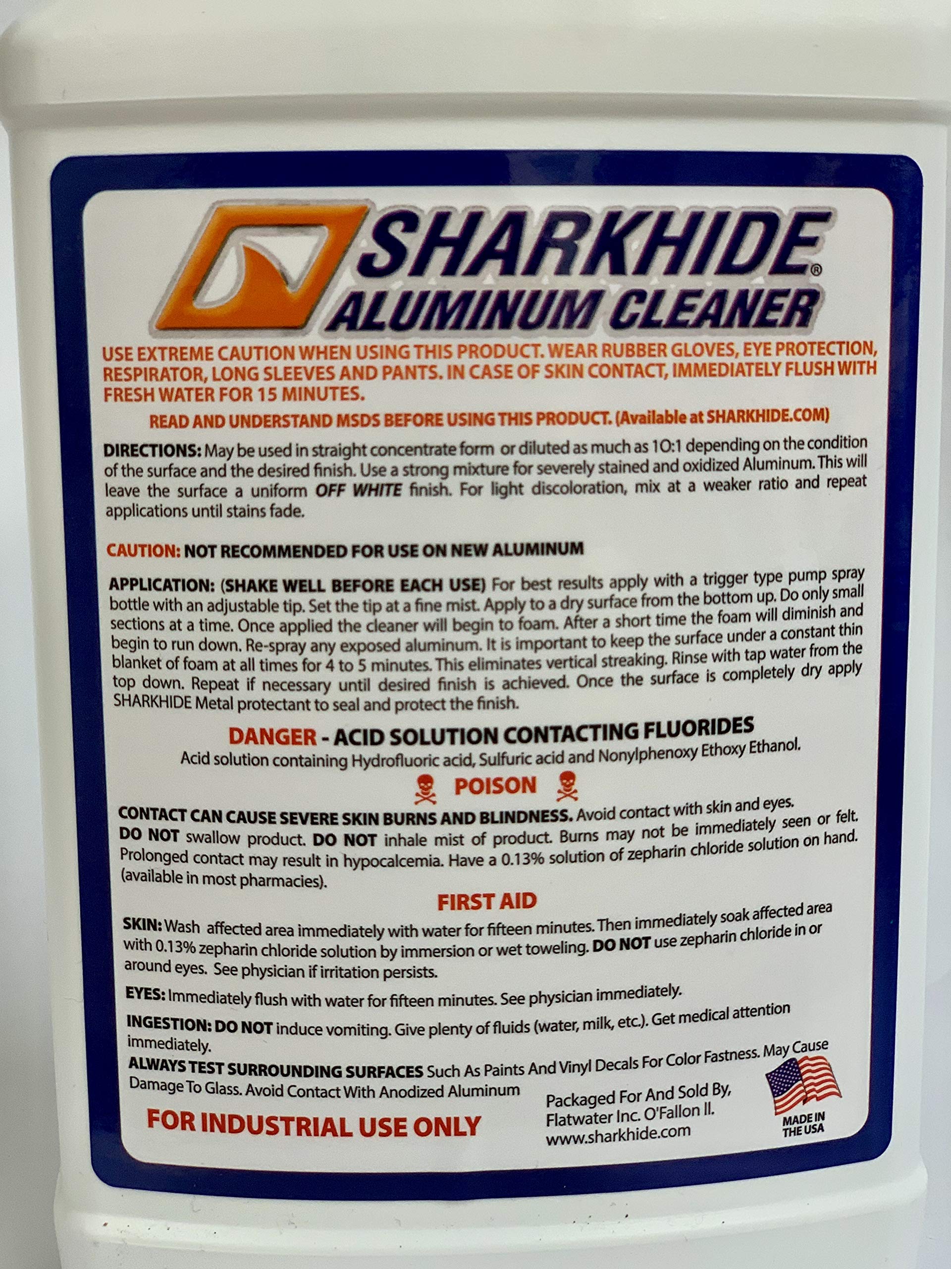 Introducing Sharkhide's Aluminum Cleaner! A boat cleaner that packs a punch! At Sharkhide, we create dependable, American-made products that are designed to make boat maintenance a breeze and that's exactly what we did with this aluminum cleaner. You have the choice in applying it directly or diluted depending on the power needed and watch as the stains magically rinse away. Oxidation, dirt, waterline stains, and other built up grime don't stand a chance against this stain remover. There's also no need to stress about those hard to reach aluminum areas since this marine aluminum boat cleaner is safe for multiple areas. This includes: paint, carpet, bunks, rubber, wiring, and vinyl decals. The best part? No scrubbing needed! Save yourself from the extra hard work when you go with Sharkhide's aluminum cleaner. Each bottle has clearly labeled instructions that help you stay safe when it's time to get the job done. Our customer's safety is extremely important to us and we want you to have the best results and experience possible! Feel free to contact us at any time with questions, all contact info can be found on our website!