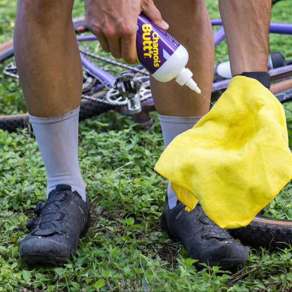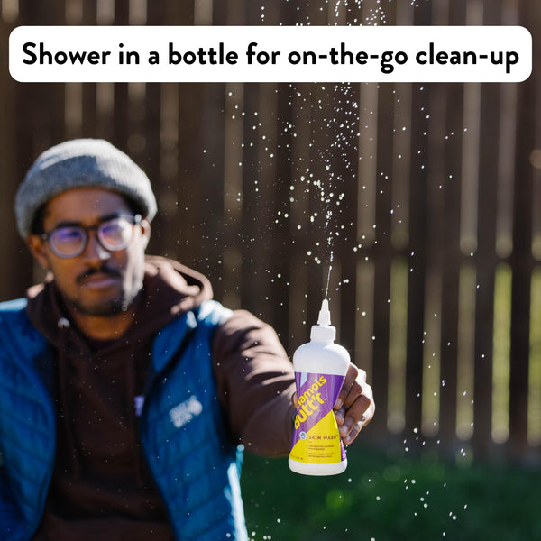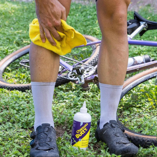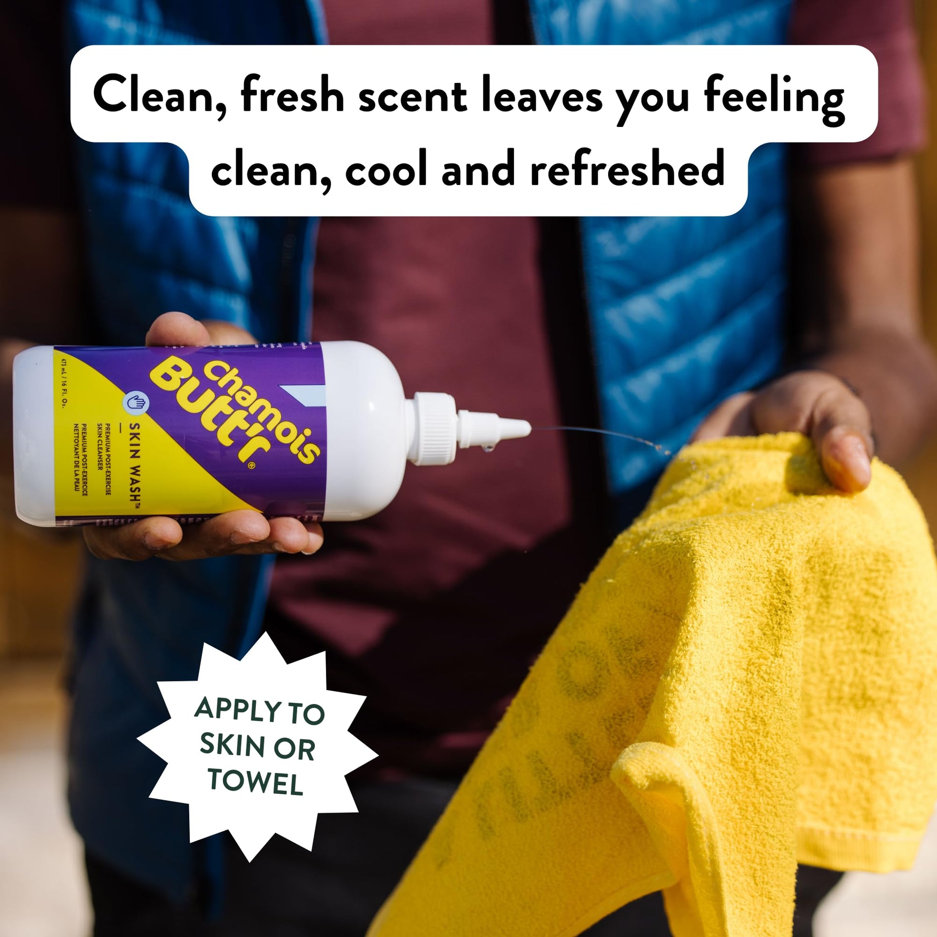 Chamois Butt'r Skin Wash is a premium quality skin cleanser developed in cooperation with pro athletes and trainers to remove sweat, road grime, massage oils, and embrocations. Cleans when water is not available. Skin Wash also reduces the warming sensation of embrocations. Use after exercise when no shower is available, or to clean up before your next podium appearance. Apply Chamois Butt'r Skin Wash directly on your skin and wipe off with a cloth or paper towel. For extra tough oils, creams, dirt, or grime, repeat process. Special formulation leaves your skin feeling clean, cool, and refreshed!
