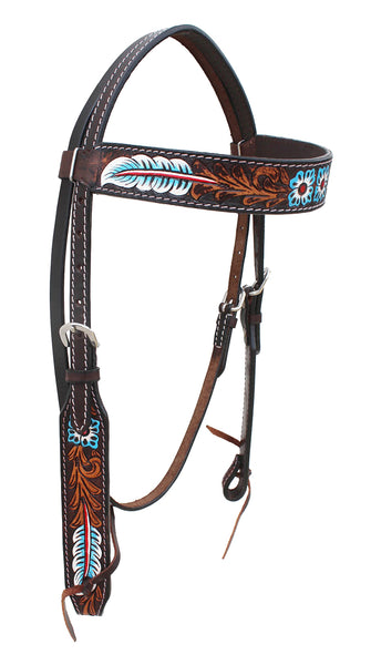 - Q: What unique features does this bridle have? A: This bridle features hand-tooled floral designs and laced edges, providing an eye-catching aesthetic.
