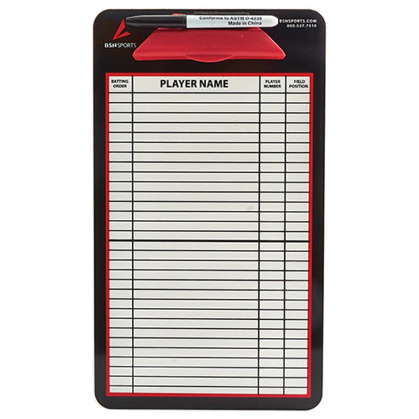 Double sided Baseball coach's board. Front player line up and back Baseball field writing surfaces. Includes premium dry erase marker. 8''W x 15 1/2''L