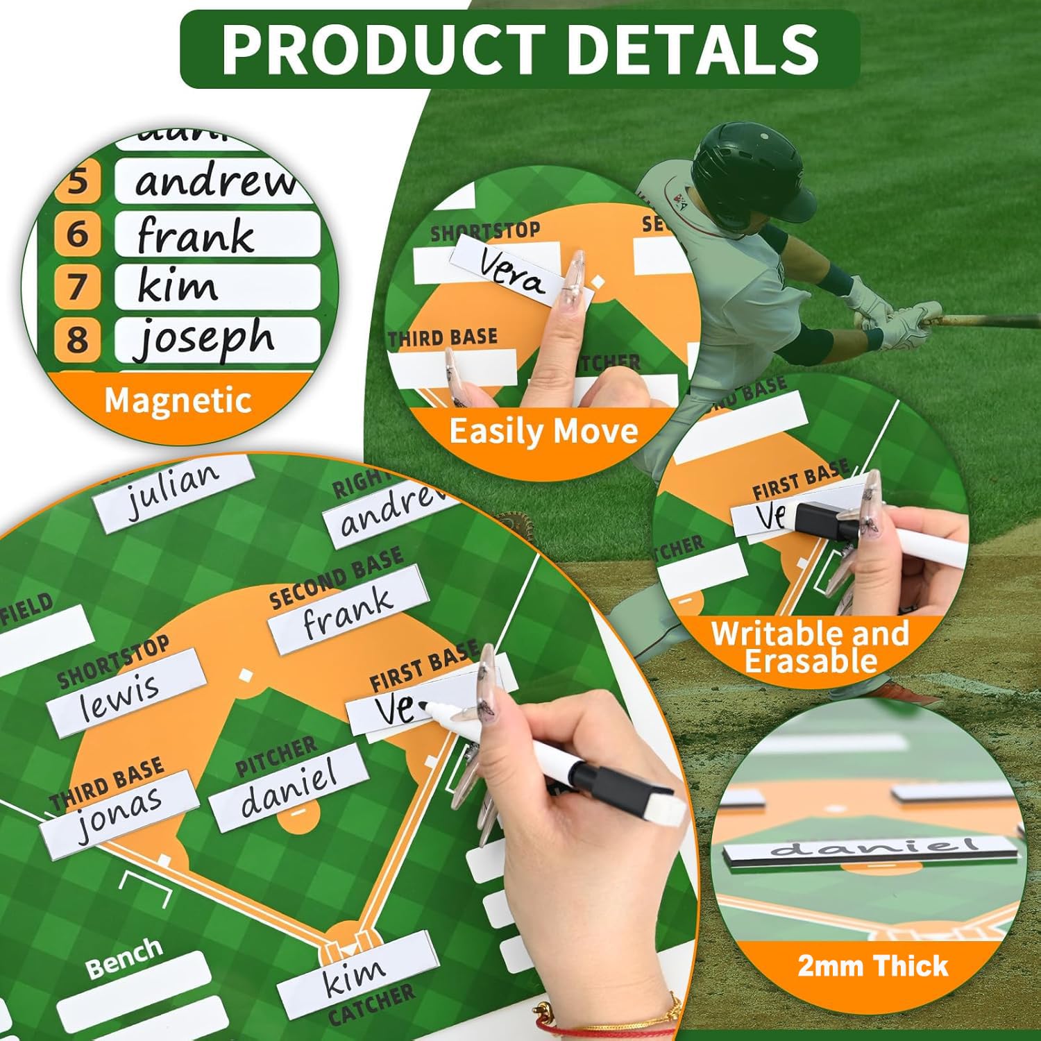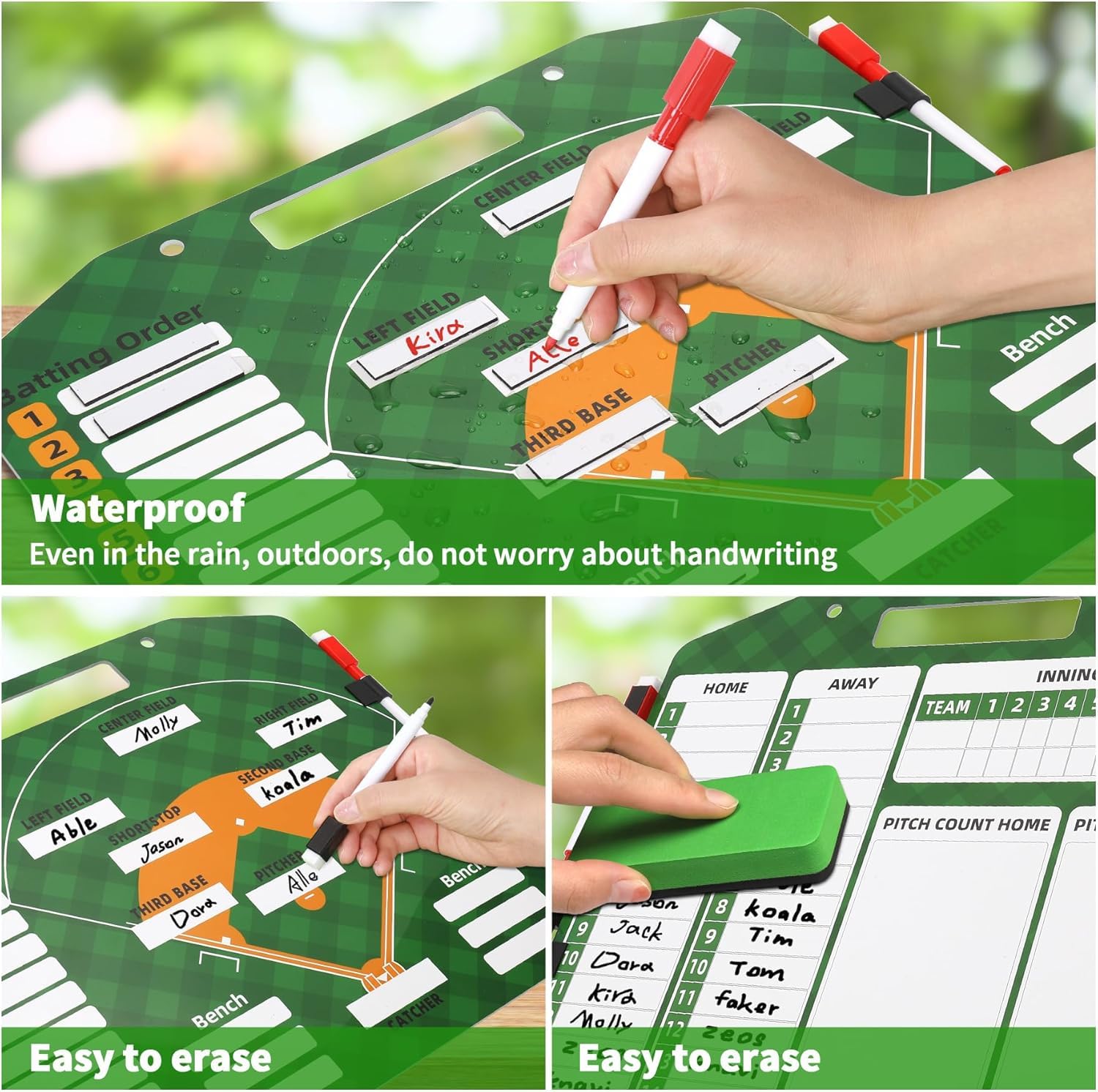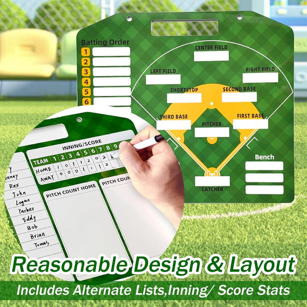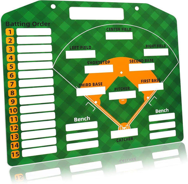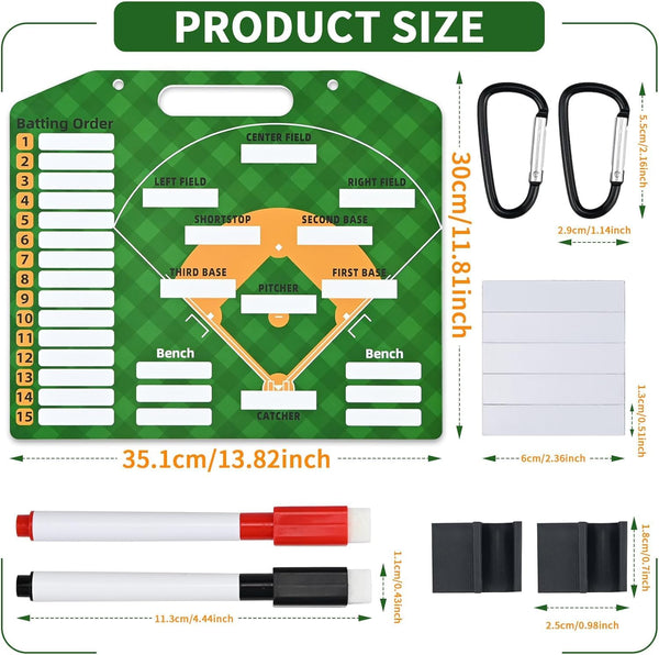 It is an essential tool for every coach at every level. The board is sturdy and comes with magnetic stripes so that you can write or label names of players on, and helps players to know where theyre going to be placed in the field. It makes offensive and defensive changes super easy. Features: Magnetic Baseball Lineup Board -Color: Green -Material: PVC -Size: 13.78x11.81 inch Package List: 1* Baseball lineup board 2* Pens 2* Pens buckles 2* Trekking buttons 30* Magnetic lineup cards