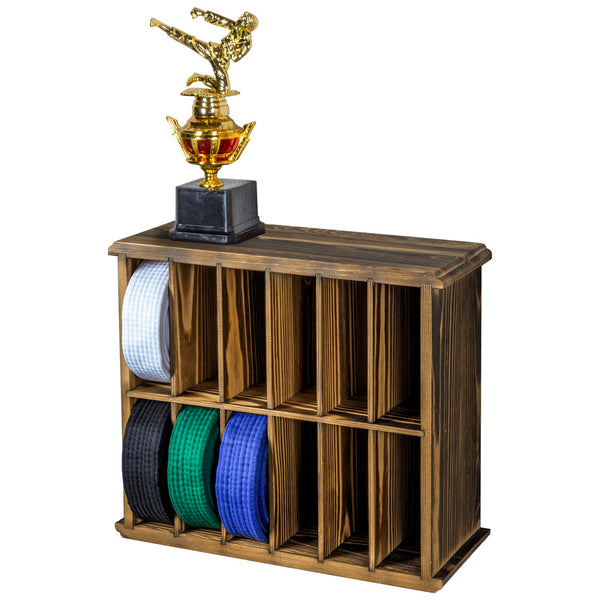 A unique way to showcase martial arts belts, this wall hanging or freestanding wooden martial arts belt holder and trophy shelf provides stylish storage and organization of ranks and awards for martial arts students and masters. Featuring 12 compartments to neatly store rolled up ranking belts, this hanging rack has a durable solid wood construct in a burnt brown finish for a country rustic look that helps belt colors stand out. A unique dual mount option allows this shelf to be hung horizontally or vertically and either way allows the top to display the most prized trophies for a decorative arrangement that will complement the earned belts. With a neutral burnt wood look, this wall cubby board has an attractive finish that will complement any d?or in a home, dorm, office, or dojo. This belt organizer is compatible with most martial arts that have a ranking system such as karate, taekwondo, judo, hapkido, Brazilian jiu-jitsu, and more, making it a functional gift for martial arts enthusiasts to proudly exhibit earned ranks in an ornamental fashion.**Includes standard wall screws and drywall anchors****Includes 4 bottom foot pads to prevent scuffing and scratching to surfaces****Due to natural material and color finish process, color and wood grain may vary slightly than shown in listing**Approximate Dimensions: Overall - 13.3 L x 5.3 W x 11.5 H; Each Compartment - 5.2 D x 1.8 W x 5.1 H (in inches)