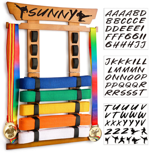 - Q: Can I customize this belt holder? A: Yes, the rack includes letters and martial arts figure stickers, allowing you to customize it with your name or other designs.