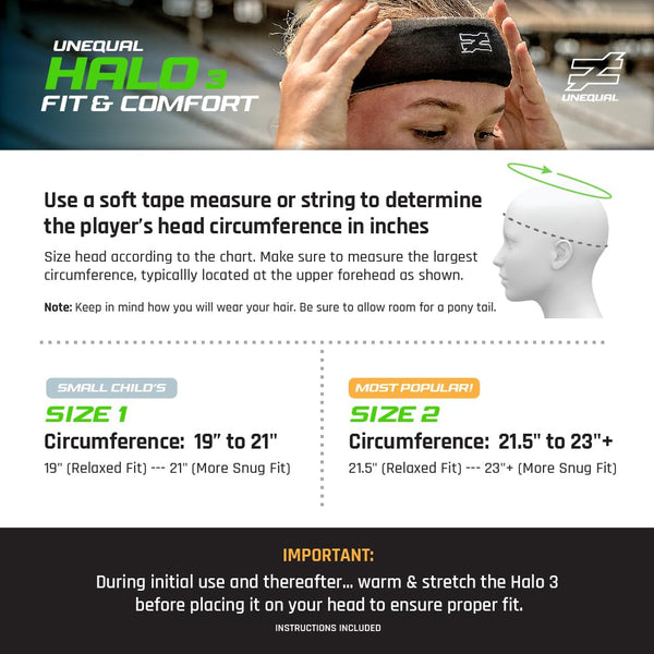 The Unequal Halo 3 has received high marks in 3rd party independent research In fact, their data shows our complete line of protective headgear to be the best performing in the country Halo 3 received VTAs ARecommendedA 4-Star Rating ItAs a very light, very thin design that looks just like a headband, which players love But donAt let itAs looks deceive you This HaloAs advanced, military-grade materials reduce acceleration and absorbdisperse impact force From newbies to veterans, the protection is noticeable and improves player confidence as they feel the difference Halo is great for non-helmet sports, including soccer, basketball, volleyball, girls lacrosse, field hockey, cheerleading, figure skating as well as other life situations where good looking head protection is needed For soccer, does not alter ball rebound speed or direction and is FIFA Law 4 compliant Halo 3 was designed for a fashionable and comfortable look 83% Polyester, 17% Spandex, black fabric with a silver logo on front Fits your head as a closed loop with a snug, stretchy fit To acquire your proper fit, use a measuring tape Halo 3 has powerful, protective properties that may stiffen in coolcold environments when not on your head Simply knead the foam with your fingers and hold it close to your body heat and it will quickly start to soften Once warm, stretch slightly, and place on your head Once you wear it for a few minutes, Halo 3 will soften even more and be so comfortable youAll forget itAs on your head Should be stored at room temperature