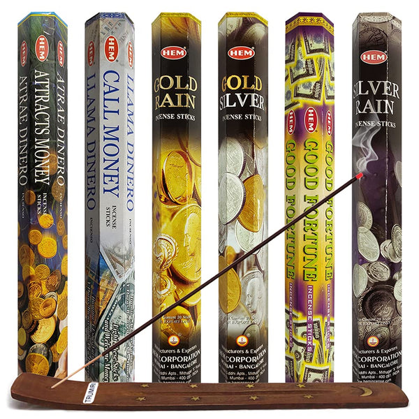 Incense and holder set 29: This is a bundled product that includes 6 money and good luck themed Hem incense sticks and incense holder Incense sticks variety pack includes Attracts Moneycall Moneygold Raingold Silvergood FortuneSilver Rain fragrances gift Set: Total 6 fragrances 20 incense sticks of each fragrance Incense holder is also included Inciensos aromaticos - Incenses are popular in almost every culture Traditionally incenses were used for religious and sprituality puposes Agarbatti Sticks - Our incense sticks are non toxic all natural organic and herbal All incense are handcrafted in India according to traditional customs using minimal tools and almost no machinery Incenses are often used for negative energy cleansing Now a days incenses are used more as home fragrance products Incenses are also used for spritual dAcor and meditation decor Incenses are also common in witchcraft supplies