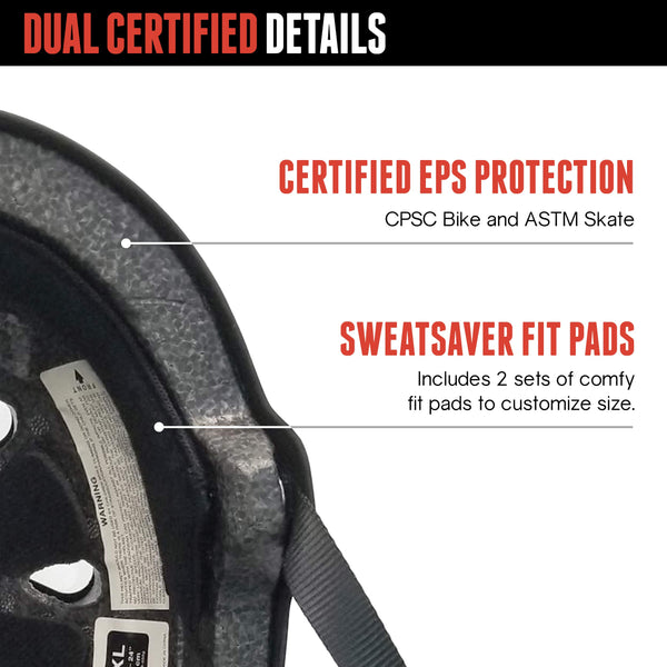 The Triple Eight Dual Certified Bike and Skateboard Helmet is the perfect blend of classic Triple Eight style, with unparalleled fit and protection. Dual-certified for both bike and skate, its ABS shell with impact-absorbing EPS foam liner is engineered for a close fit and low profile. Ideal for biking, skateboarding, scooters, BMX, roller derby, and commuting, the helmet complies with U.S. CPSC Safety Standard for Bicycle Helmets for Persons Age 5 and Older and ASTM F-1492 Skate safety standards. The Triple 8 Dual Certified Bike and Skateboard Helmet includes two different sets of removable Sweatsaver Fit Pads to customize fit, and has an adjustable chin strap with side release buckle. Available in three sizes: Size XS/S fits 18.9 - 21.25 in (48 - 54 cm), S/M fits 21.5 - 22.75 in (55 - 58 cm), L/XL 23.25 - 24 in (59 - 61 cm). To determine size, measure with a soft measuring tape or string. Helmet liners should be used to further customize the fit.
