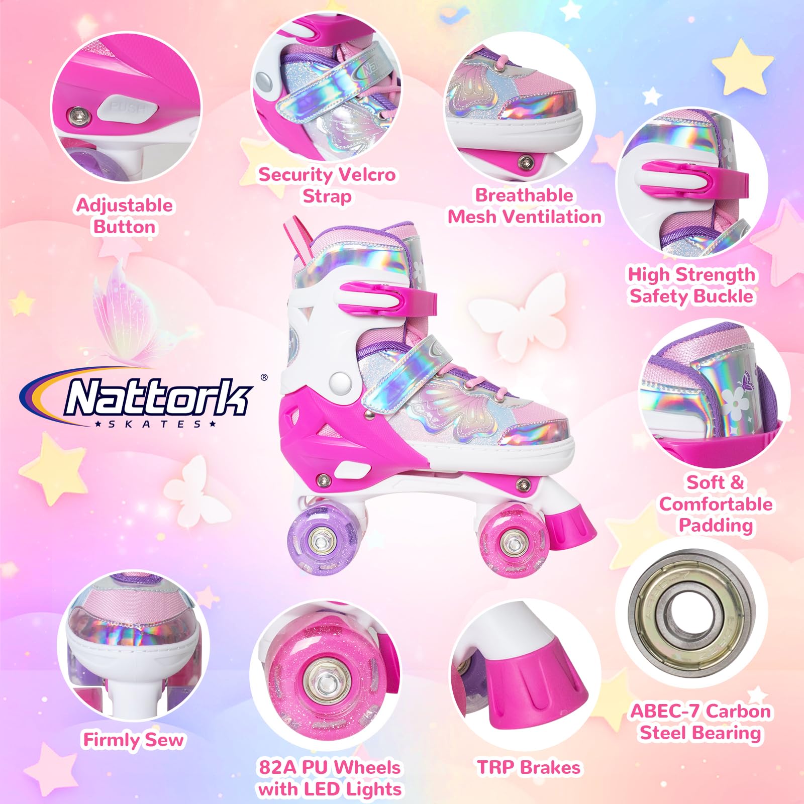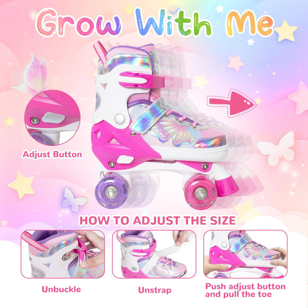 look at these things are what you were worried about when buying this product : 1. will you still worried about what birthday gift to give your child? 2. For cultivate children's independent practical ability, but there is no way? 3. Worried that after buying and wearing the shoes, the shoes will not be well tied to the child's feet? 4. Child grows up very fast, worrying about changing shoes once a year? our product is very suitable for your current needs! ! ! Spend less money to meet your greatest needs!!! ?The Skates shape is finished through stitching, injection and die-casting processes, so that the upper is more wrapped. ?Seamless adjustment, more user-friendly design, the fastening material of the fixed buckle is made of a more wear-resistant and stronger nylon material, which fits the ankle tightly. ?The bearings of the wheels are made of chrome steel, reached the professional ABEC-7 standard, more smoother when sliding ?Roller skating is very popular among all ages. This is an O~!M~!G~! Skates, children will be very happy to receive this superior quality gift !!! what you get! ?a pair of roller skates ?12-month warranty ?30-days Free return and exchange