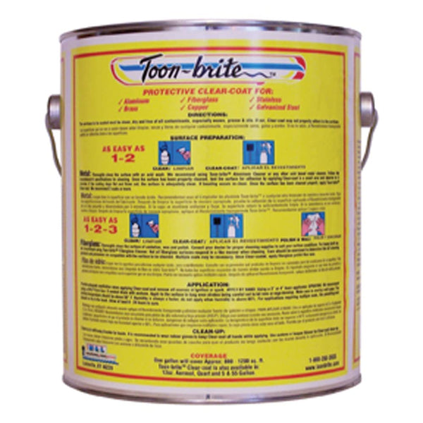 This Toon-Brite Protective Clear Coat for Boats rejuvenates fading or oxidizing metal surfaces and provides a long-lasting barrier against the elements. It is a perfect clear coat option for aluminum, fiberglass, brass, copper, stainless, and other metal surfaces. This protective clear coat is designed from a corrosion-resistant non-conductive formula and will make future boat cleaning considerably easier. It will provide years of protection against oxidation, UV rays, weathering, stains, salt spray, and electrolysis. Easily apply a clear-coat with either a 3-4 inch foam brush or spray it using an HVLP type sprayer. Be sure to clean and dry the vessel surface prior to application.