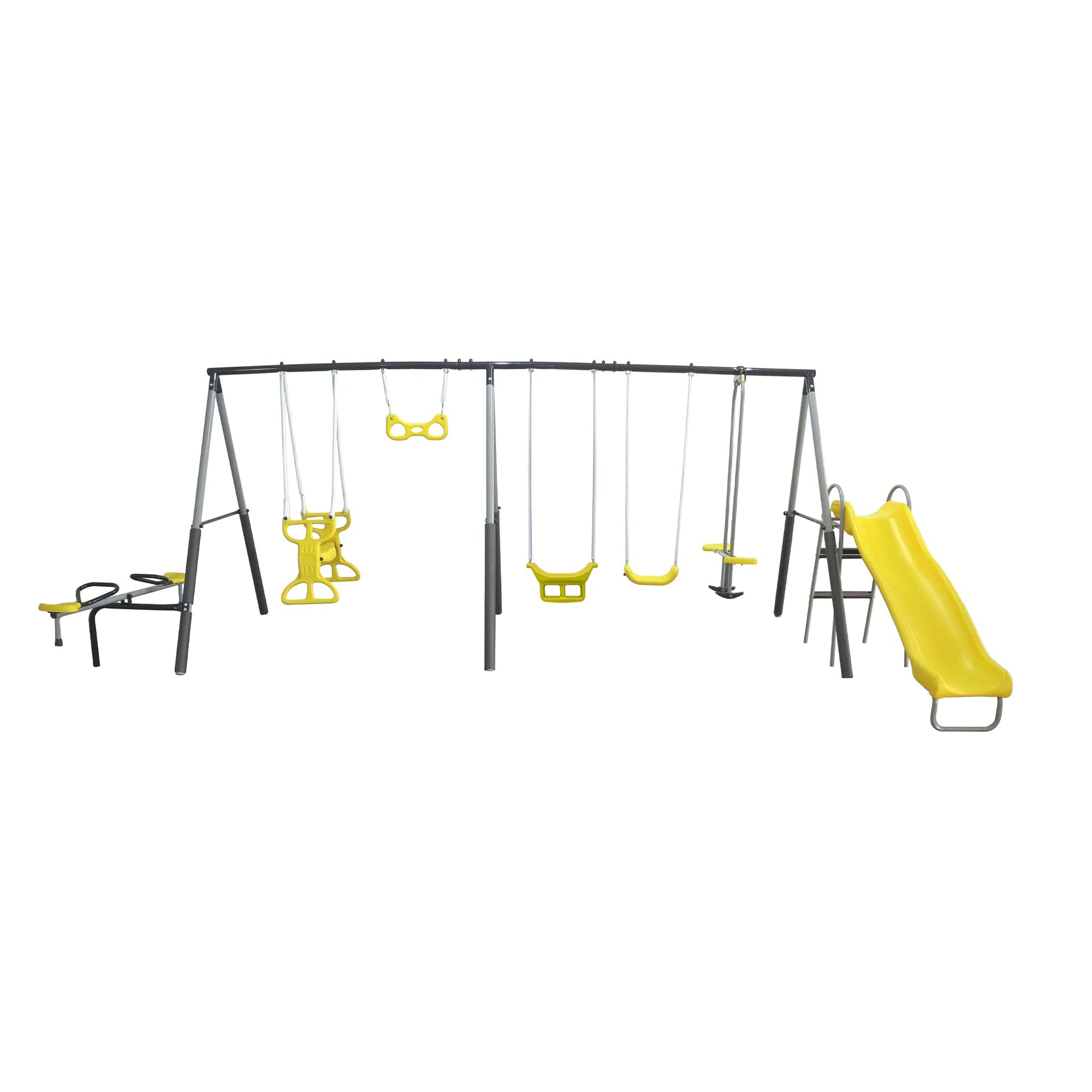The rising sun play land is a 6 leg frame swing set that accommodates up to 10 kids. It includes 1ea-swing, 1ea-stand N swing, 1ea-deluxe HDPE blow molded trapeze swing, 1ea-seesaw, 1ea-blow molded Glider, 1ea-metal Glider and 1ea-6'6'' blow molded double wall wave slide. The frame legs are 2'' diameter x 20 gauge wall thickness, top bar is 2'' diameter x 20 gauge thickness. Safe-touch PVC chain covers on the blow molded swing seats for no pinch. The blow molded Glider seat two riders, the metal Glider seats two riders. The seesaw has injection molded safe seats for two riders. Black and silver frame colors, Yellow seats, and a Yellow wave slide. The wave slide has handrails and a 'stop landing' for safe-stop entrance to ground. Up to 10 kids can play on the rising sun play land at once with an 100 lbs. per seat/play maximum. Recommended age use of 3-8 years. Designed and engineered for parents 'safe and fun' thoughts for their kids. The swing sets from XDP Recreation are constructed of 2'' diameter steel tubing frames with powder coated paint. XDP's steel frames have welded (no bolts) corner brackets for superior stability and ease of assembly. foam safety leg covers are included on some sets, on others they can be added as an accessory. all of our seats, riders and handles are made of a durable blow molded polyethylene (HDPE) material. The one-piece wave slides are HDPE (high density polyethylene) blow molded. The blow molded components provide additional quality, value and performance to the XDP Recreation products. Ease of assembly and safe assembly are important. The two-wall, blow molded, one-piece slide ensures safe & fun use for children. Our swings have ''safe-touch'' chain covers that are HDPE blow molded one-piece components for strong and safe use. All XDP Recreation swing sets are ASTM and CPSIA compliant.