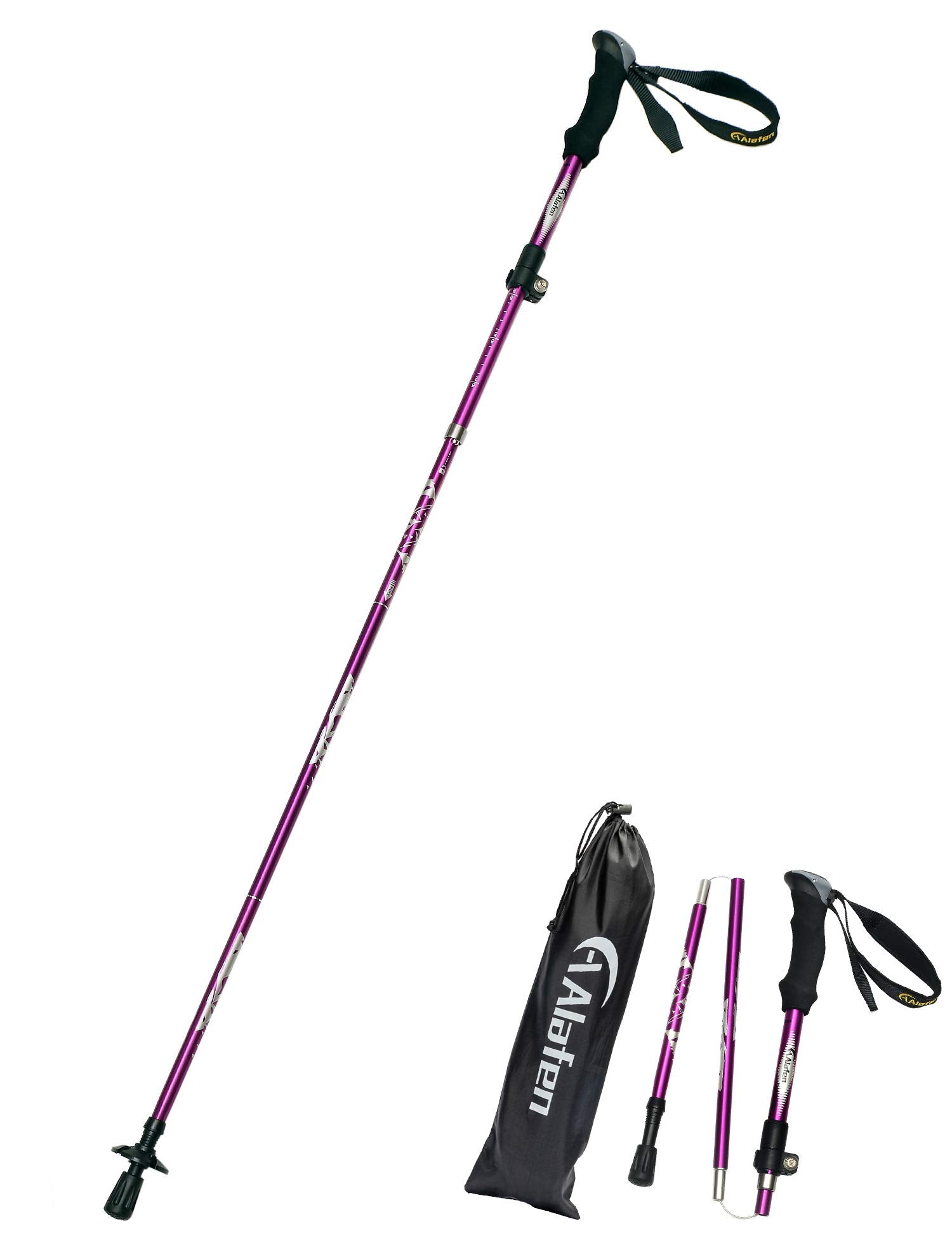 Please note: All the A Alafen Brand trekking pole only sold on ALAFEN Store Alafen Foldable Ultralight Trekking PoleFeatures:1)Sweet-absorbent EVA Handle:Using EVA foam material,and a non-slip groove design, comfort grip, strong non-slip and sweat-absorbent2)confortable Strap:Quick-drying fabric wrist strap, comfortable,breathable, fit the wrist, adjustable flexibly3)Strong Shaft is made of super tough 7075-T6 aircraft grade aluminum alloy This alloy is often referred to as the strongest aluminum alloy because it has the strength of many steels, while retaining aluminums lightweight qualities The surface of the alloy is created through an advanced oxidation process It is very hard and protects the metal from weathering and corrosion4)Safer Lock system:3LS locking system, one second quick lock, safe, stable and reliable5)Tungsten Steel Tip is extremely hard and excellent for use on the roughest hiking trails Included also are a Rubber Point cover for use on pavement and a Snow Saucer for use in snowSpecifications:color: Sky Blue Net weight:98oz275gFolding Size: 134inch34cmUnfold Size: 433inch-492inch110cm-125cm Handle material: EVA foamShaft material: 7075 Aluminum AlloyRod tip material: Tungsten SteelLock catch type: Strong ABS + Mental lockWarranty:Apart from the EVA for the Handle and the Walking Stick Tip Protectors, the product can enjoy one year limited warranty for the non-artificial damage
