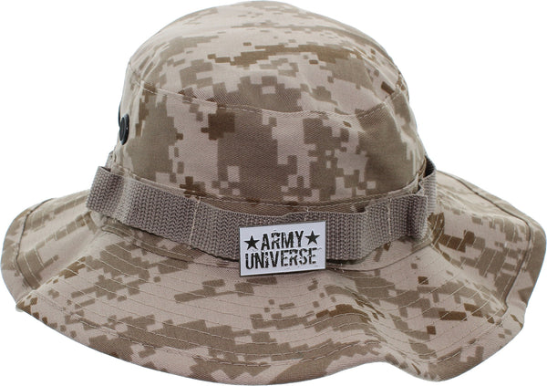 Our boonie hats, also known as bucket hats, sun hats, fishing hats or jungle hats, are the perfect answer to beating the heat this summer. Great for everything from gardening to golfing! You can even look fly while fly fishing! Our boonie hats are made from a comfortable poly/cotton blend fabric. They are designed with ventilation holes to reduce the build up of heat while the soft, flexible 2.5 inch wide brim blocks out the sun. An adjustable chin strap ensures that you will never loose your boonie while hiking, camping or boating. The tactical band is perfect for holding your spare lures, foliage for extra camouflage or your free new signature Army Universe pin. The soft material can be rolled up for the to provide handy, collapsible, packable, portable shade anywhere you go. We offer a wide range of colors and patterns to match your style. Every order comes with a free Signature Army Universe pin. Choose from ACU Digital Camo, Black, City Camo, City Digital Camo, Coyote Brown, Desert Camo, Desert Digital Camo, Digital Woodland Camo, Khaki, Navy Blue, Olive Drab, Red Digital Camo, Sky Blue Camo, Sky Blue Digital Camo, Smokey Branch Camo, Subdued Urban Digital Camo, Tiger Stripe Camo, Total Terrain Camo, White, Woodland Camo, Urban Tiger Stripe Camo, Red Camo & Midnight Blue Digital Camo.