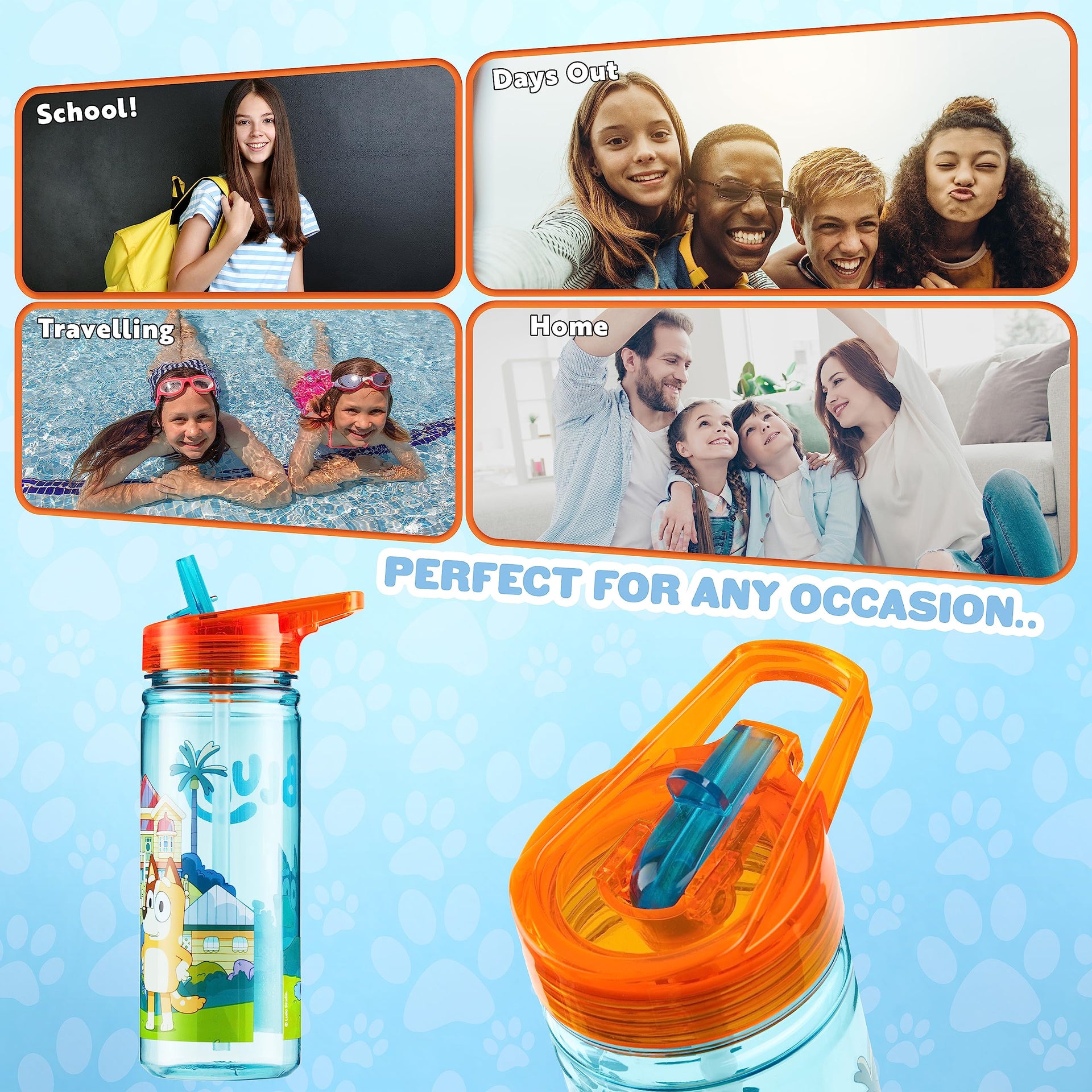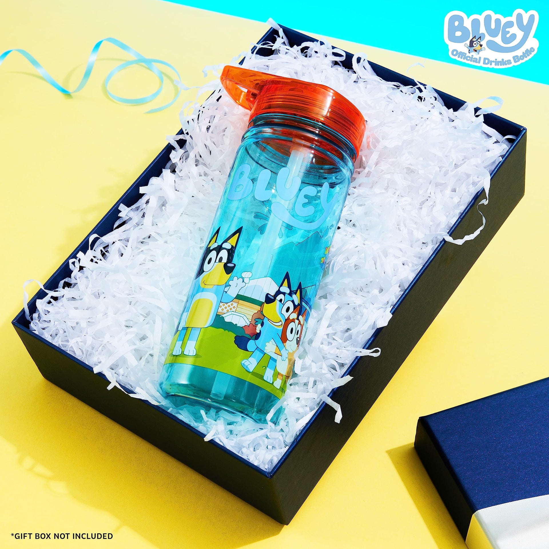 Bluey water bottles with straw or twist cap Say hello to the ultimate accessory for Bluey fans who want to look cool and stay hydrated all year round This girls and boys drinks bottle comes in a range of cool Bluey-themed designs, including a design with a convenient flip-up straw or a 3D Bluey design twist cap These bottles are BPA free and come in either 560ml or 580ml capacity, making them perfect for daily use at nursery, preschool, or days out These cool reusable bottles also make great Bluey gifts for boys or girls who are fans of the popular TV show!