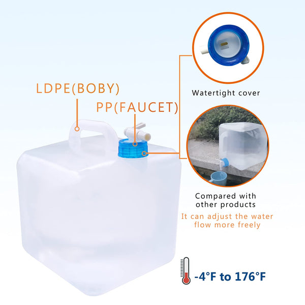 Product: collapsible Water container, Emergency Water Storage carrier Jug, Potable water storage containers 13 gallon26 gallon39gallon53 gallon Material: High quality LDPE material, BPA-free, food-approved high grade polyethylene Safe & Reliable Daily Use & Emergency: This water container is suitbal for outdoor and indoor It is foldable, durable, reusable water storage bag designed to go anywhere, easy to install on and usegreat for household, camping, hunting, travel, outdoor, car, picnic, garden,vacation, hiking, barbecue, BBQ, etc AND could be the most important emergency preparedness for life saving in hurricanes, tornadoes, floods, fires, droughts, earthquakes Specification: 13 gallon 5 Liter Expanded Size:(73 * 73 * 89 inches)185*185*225 cM Folded:(69 * 69 * 24 inches)175*175*6 cM 26 gallon10 Liter Expanded: (89 * 89 * 106 inches)225*225*27cM Folded:(79 * 79 * 24 inches)20*20*6 cM 39 gallon15 Liter Expanded: (98*98*114 inches) 25*25*29cM Folded:(102*94*28 inches)24*24*7 cM 53 gallon 20 Liter Expanded: : (114*114*132 inches) 29*29*335cM Folded: (102*94*28 inches) 26*24*7 cM Tips: 1Recommend to use soda watervinegar to immerse the container for 15 minutes before the first time use 2Avoid to fill with dangerous or corrosive chemical liquid if the container 3Keep the water jug far away from fire, incisive things and high temperatures