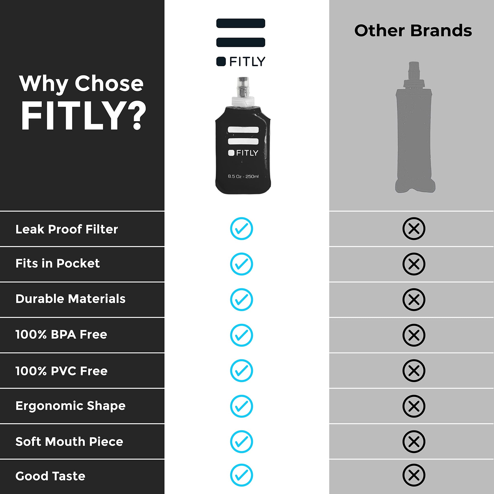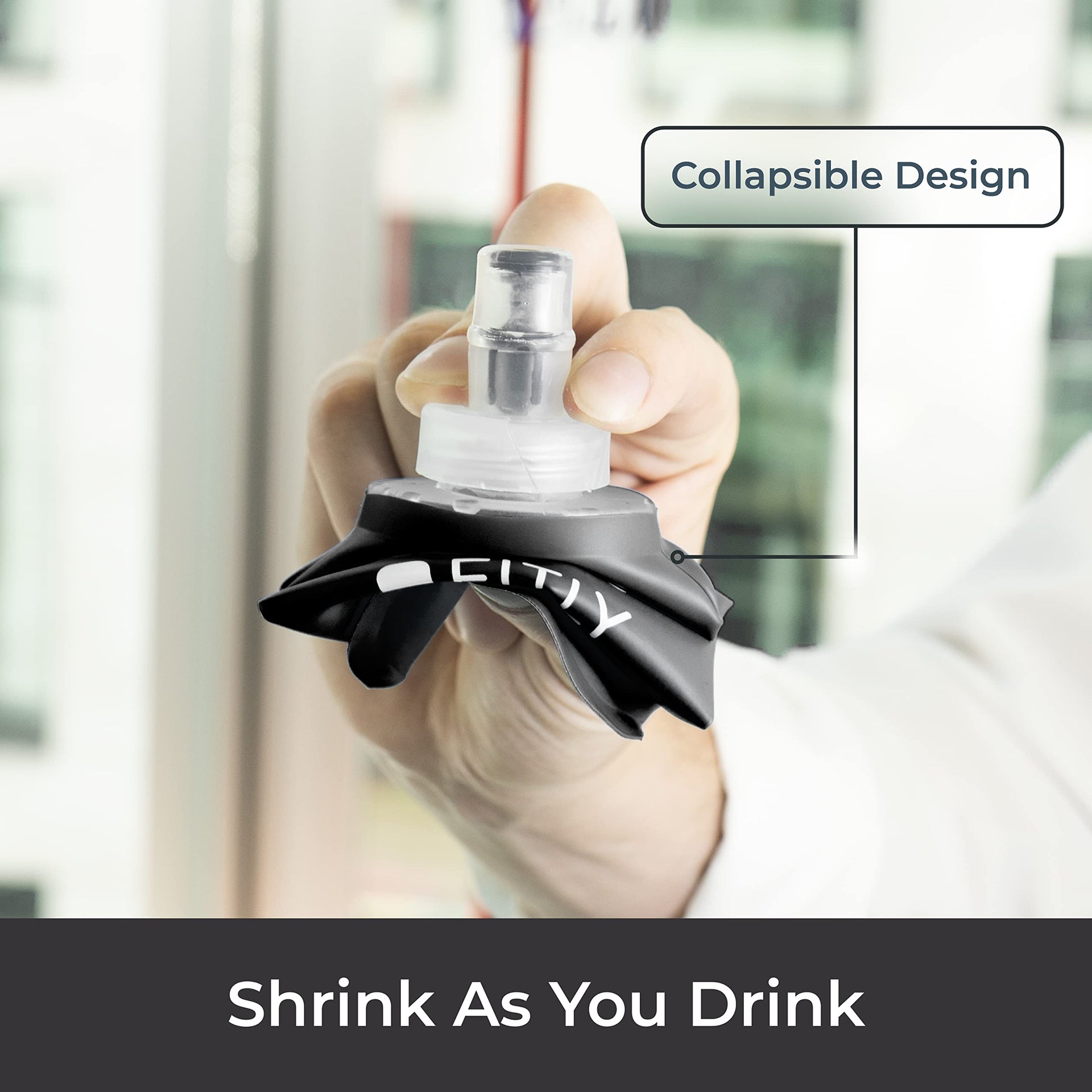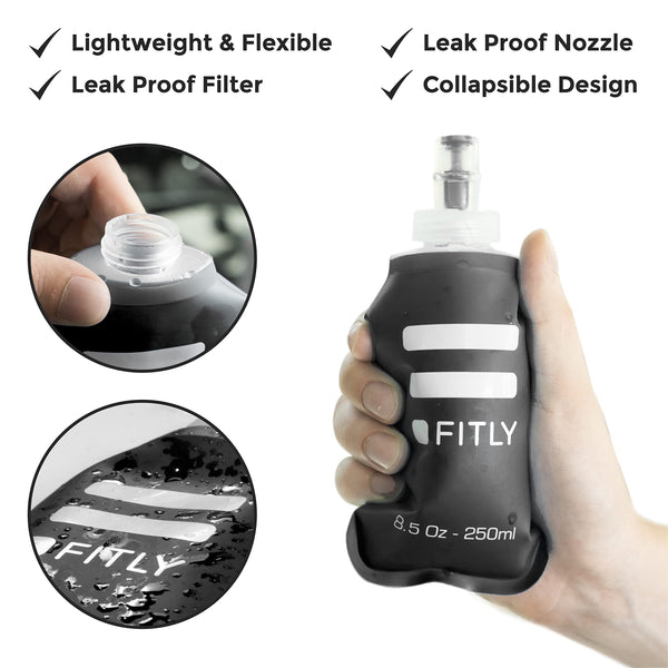 FITLY Flasks are ideal for quick drinks on the run gobble up a gel, wet a dry throat, or re-hydrate Designed to be used while running or biking Stores directly in your front, side, or back pockets FITLY Flasks shrink as you drink so nothing ever moves, bounces or rattles