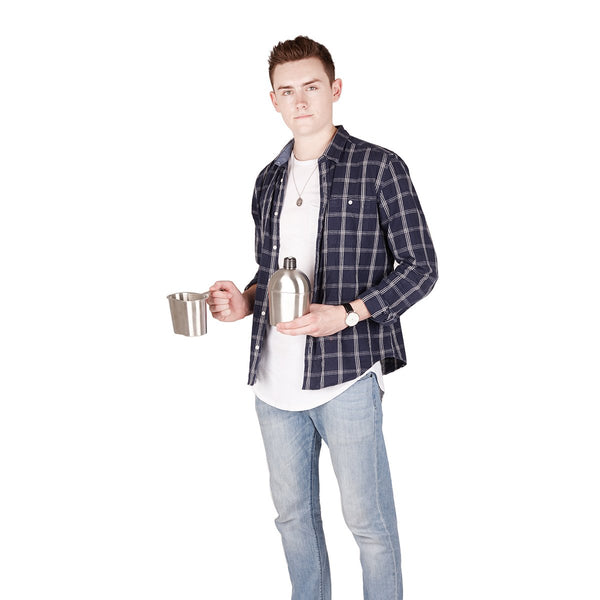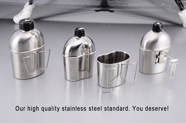 canteen capacity: 1 QT (1 Liter) cup capacity: 05 QT (05 Liter) Material: Stainless steel Style: WWII US Army gI canteen Size: 51x31x73 cup Size: 52x31x39 Thickness: 6 mm Note: 1 The other brands cover may not applicable 2 Remove all plastic parts before heating 3 If you meet any problem, like leaking or cap broken when you receive or in 3 months, please let us know, we will resend new one to you Package 1x canteen 1x grab Handled cup 1x Nylon cover