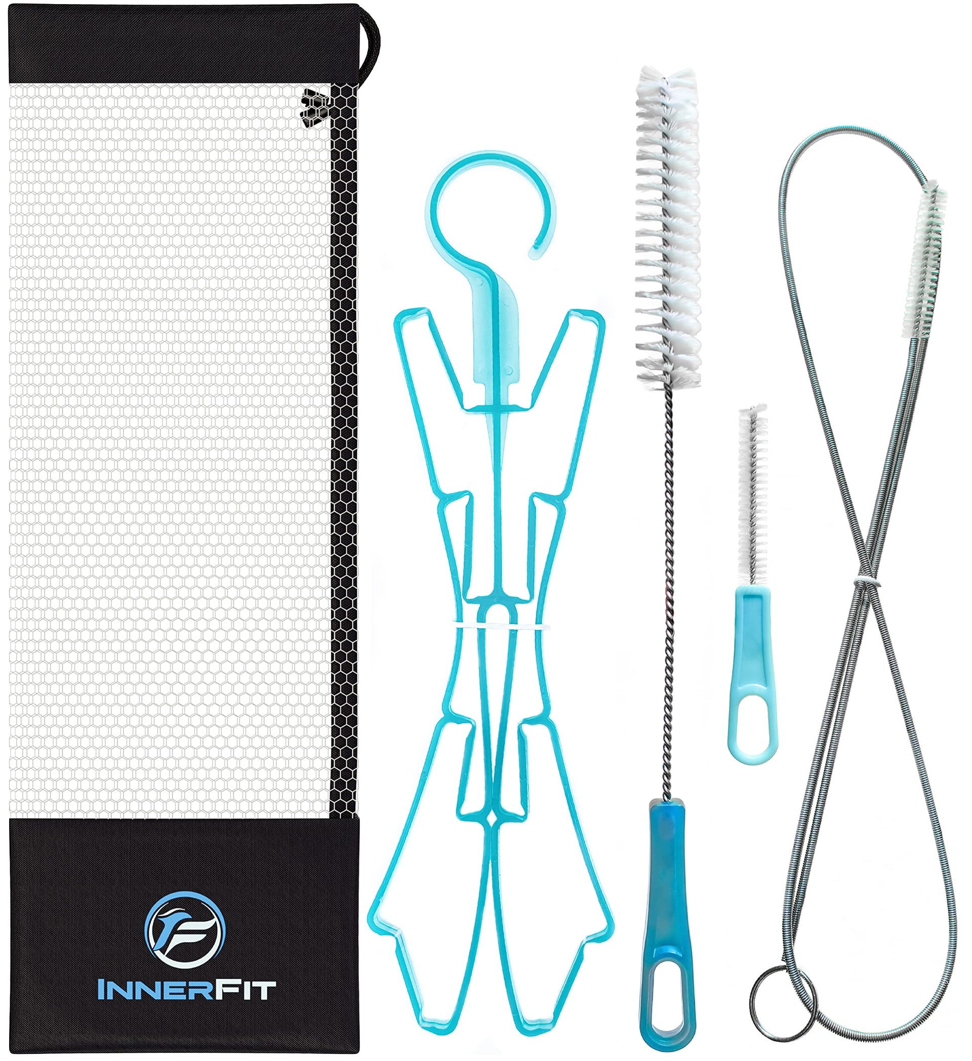 - Q: What is included in the InnerFit Hydration Bladder Cleaning Kit? A: The InnerFit Hydration Bladder Cleaning Kit includes three soft and durable brushes designed for thorough cleaning, a collapsible frame for air drying, and a mesh carrying pouch to keep everything organized.
