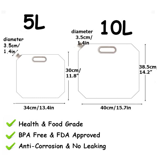 Why choose Me in Your camping ocket Size after collapsing Space Save in Storage but Portable to use Perfect for storing in between uses Simply clean, air dry, fold, and roll ood grade Material, non-toxic, Safe to store water or other liquids reezable containers bring cool in your outdoors in the summer urable, reusable storage bags are perfect for camping, hiking, travel, concerts and other outdoor activities Screw-on cap provides a leak-proof seal to ensure a dry and comfortable journey 5 Years Warranty New replacement for the defective devices within 5 year Worry-free for the water carrier Specification: color: Bule+Transparent Material: Food grade PE Plastic, Safe Temperature: -20 degrees 60 degrees Package Included: 1*5 Liter +1*10 Liter collapsible Water carriers You will never regret to choose it as an excellent survival or emergency water carrier