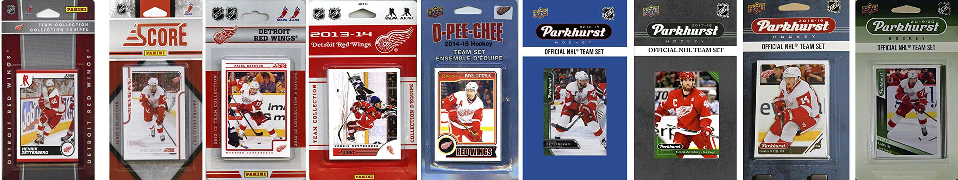 This package is a must for all Detroit Red Wings fans. You'll get Official Score NHL team sets from 2010, 2011, 2012, 2013 and a 2014 O-Pee-Chee team set and a 2016, 2017, 2018 and 2019 Parkhurst Team Set featuring your favorite Red Wings players.