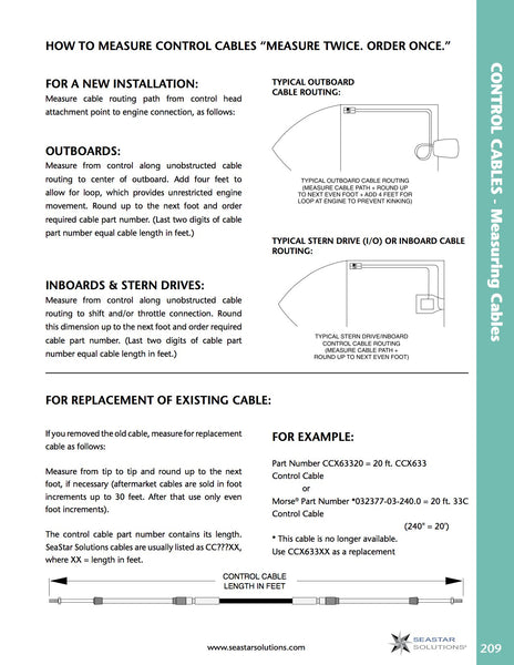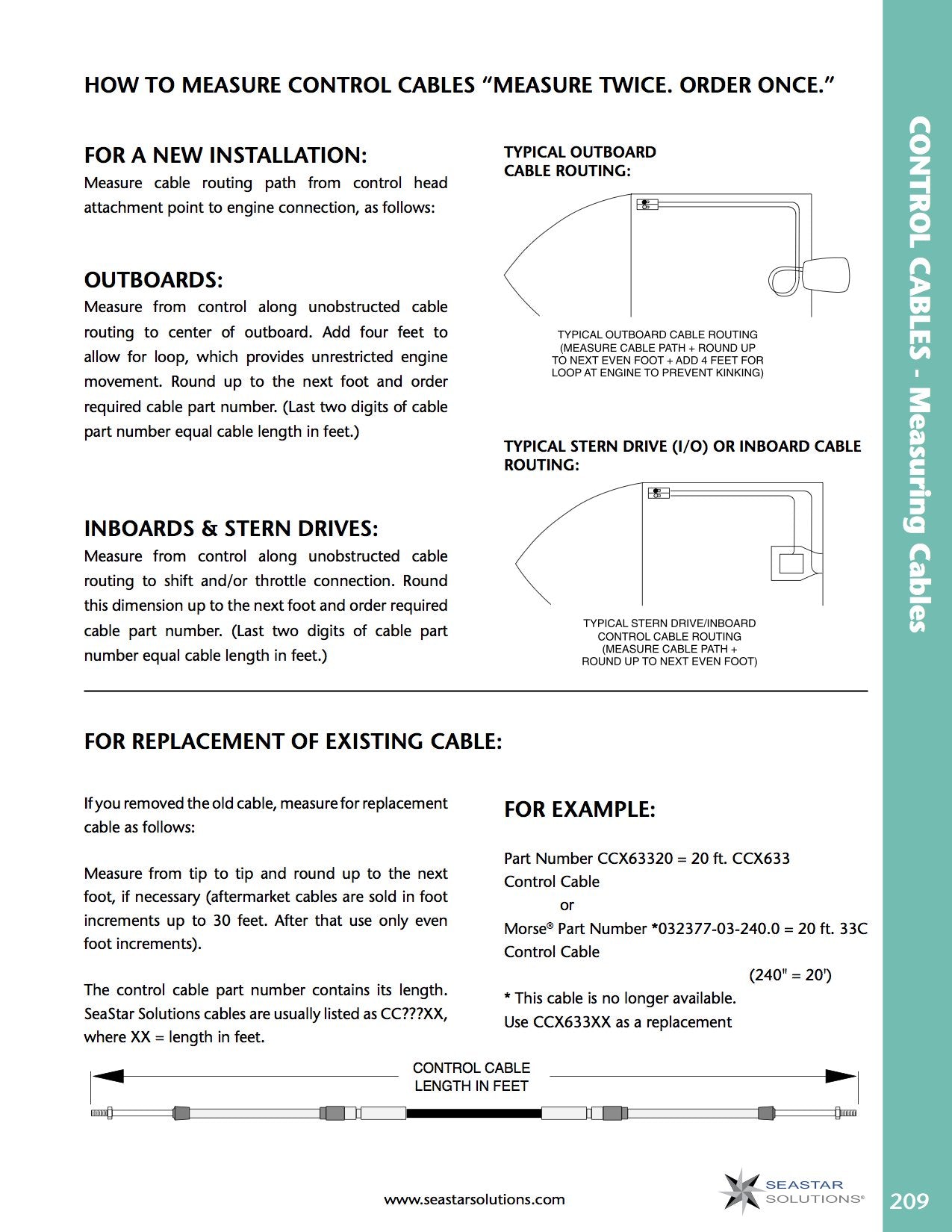 SeaStar Solutions' (formerly Teleflex Marine) has set the standard with their Control Cables in the Marine Industry by using Superior Design, Technology and Materials.SeaStar Solutions' Premium XTREME Universal type 3300/33C cables are designed to fit aftermarket engine controls as well as OEM units from BMW, Chrysler, Honda, Nissan, Suzuki, Volvo, Yamaha, Tohatsu and many inboard applications. Will also fit Evinrude, Johnson, OMC and Mercury engines with the correct engine adapter kit (also available through SeaStar Solutions' .SeaStar Solutions' unique XTREME Technology incorporates a patented Splined Core. Ridges on the core allow a close fit with the cable''s inner liner and provides for easy movement with minimum lost motion.FEATURES Designed to fit aftermarket engine controls as well as Original Equipment Manufacturer units 10-32 Threaded Terminal and a Clamp-Type fitting at each end Cables use the Existing Connection Components XTREME Control Cable Technology with a 4 inch minimum bend radius versus an 8 inch minimum bend radius for standard cables 0.34 inch Super Tough HDPE Jacket which resists abrasion and withstands the effects of UV, salt water, chemicals, gasoline and oil 0.033 inch Oil Tempered Lay Wires for Superior Strength and Performance Unique XTREME Splined, Coated Core Element for Maximum Smoothness with Minimal Lost Motion Stainless Steel Terminals and Conduit Fittings for added corrosion protection Long Wearing HDPE Liner - Ultra Smooth and Lubed for Life Made in the U.S.A.FORSeaStar Solutions' and Other Controls which accept Universal type 10-32 threaded cable endsSeaStar Solutions' XTREME Control Cables are ideal for Foot Throttle Applications on performance/bass boats AND designed for Complex and/or Long Cable Runs (or to simply create a superior feel). They are also the #1 Cable Choice for OEM and Engine Manufactures.All SeaStar Solutions' control cables exceed ABYC safety standards and are type certified to ISO/IMCI and NMMA requirements.SeaStar products are backed by a two-year recreational user warranty against manufacturing defects. SeaStar Control Cables are environmentally tested for marine applications.