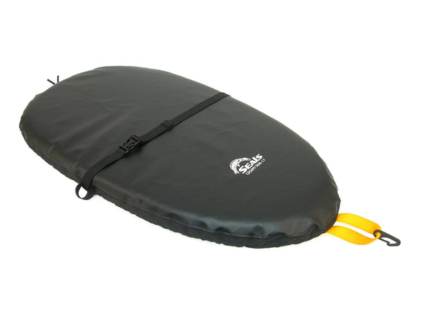 With the Seals Cockpit Seal, keep the weather, bugs and debris out of your kayak whether its on the roof of your car or stored in your backyard. Made with tear-resistant cargo cover material with superior UV protection that is durable and will keep water out. A tether hook and the hull strap security feature keeps the cover attached to your boat while driving or in high winds. Rim grip technology keeps the cover in place. Adjustable bungee cord rim attachment keeps the cover from falling off or collapsing due to water weight. Double-stitched seams for durability. Available in Stock Cockpit Sizes: 1.2 thru 7.0. Use the Seals database to determine the size of your kayaks cockpit.