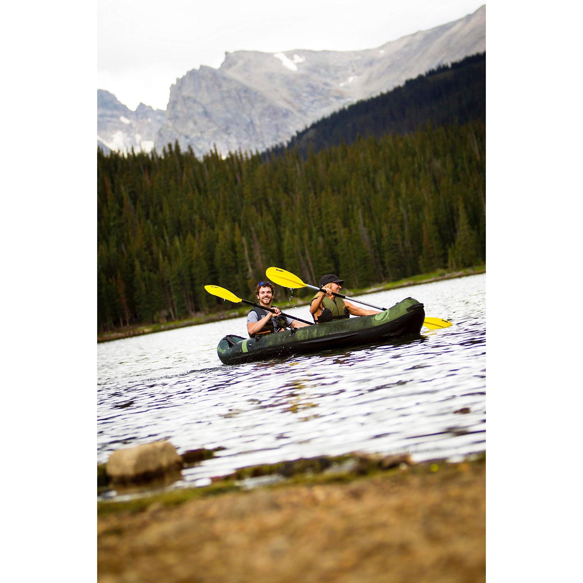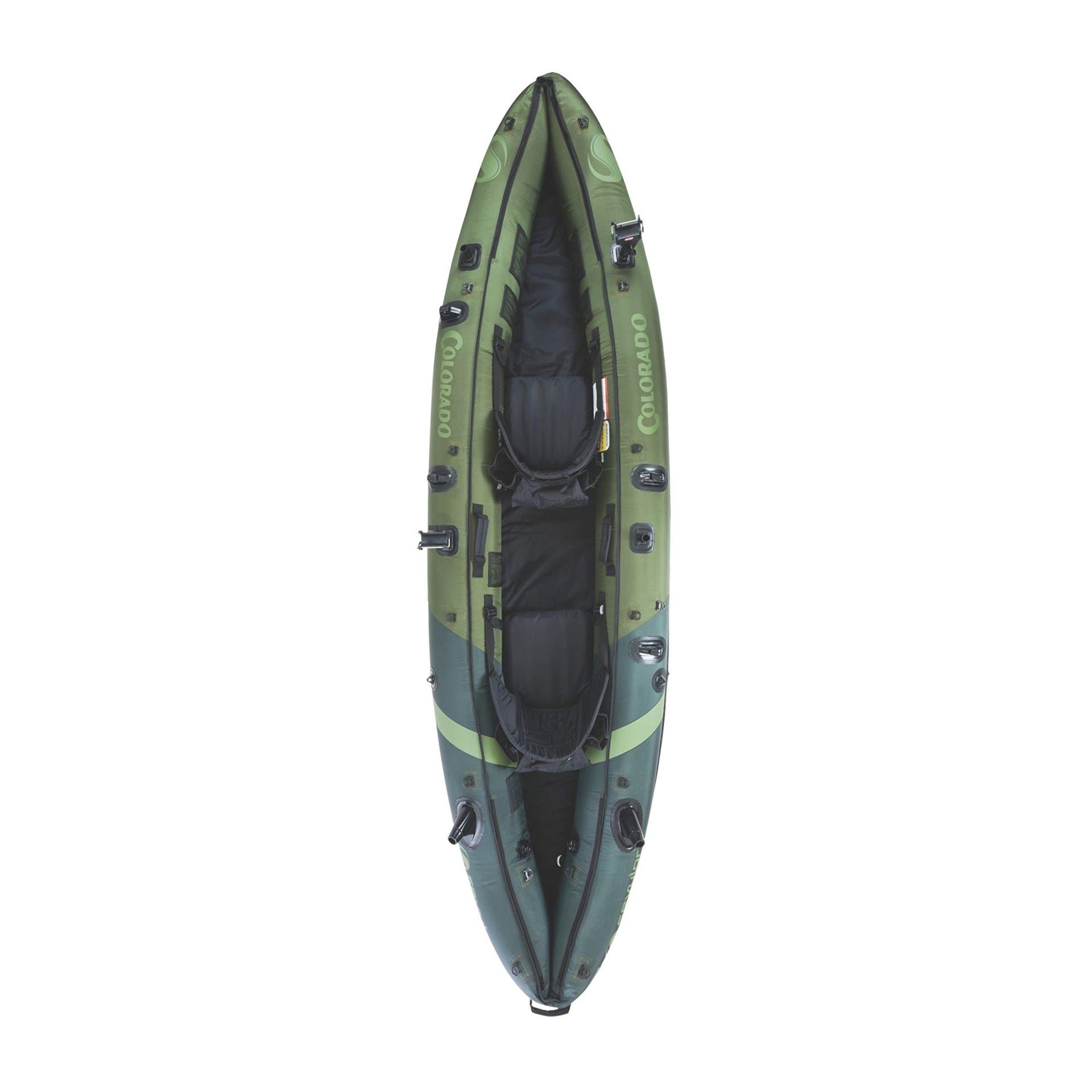 Take home your catch limit with a buddy after a day in the Sevylor colorado 2-Person Fishing Kayak With 18-gauge PVc, a thick tarpaulin bottom and a tough nylon cover, this kayak is durable enough to get you to your favorite out-of-the-way fishing hole Just in case, though, the multiple air chambers will help you get back to shore The adjustable seats will keep you paddling comfortably the whole trip But if you want to move more easily, you can always add the Sevylor trolling motor and store your paddles in the convenient holders The Berkley Quick Set Rod Holders let you adjust your pole angle for the ultimate hands-free fishing experience With your hands free, its easier to take care of your gear, which stores nicely in the mesh pockets or attached to D-rings