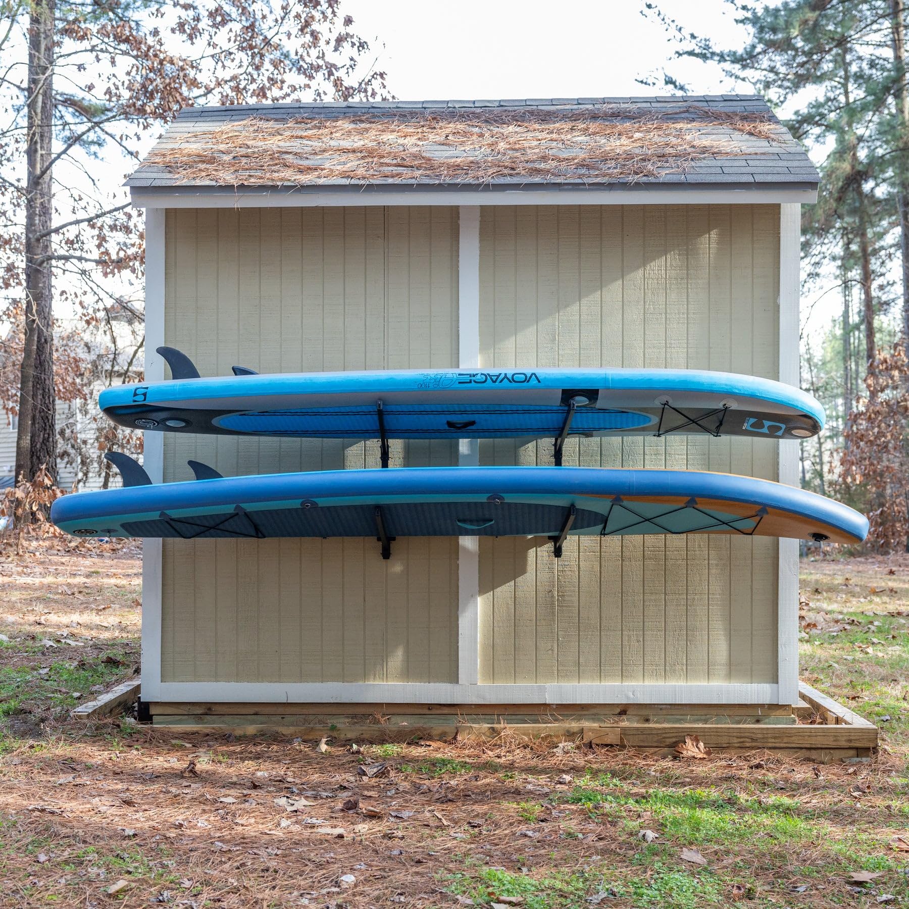 Store your Stand Up Paddle Boards outside for easy access with this wall-mounted SUP storage rack! The rack holds up to 2 standup paddle boards, kayaks, or canoes. It's weatherproof coating and durable foam padding are built for the elements. Industrial-grade steel and aluminum support up to 200 lbs for rock-solid paddleboard storage. Adjustable levels fit most paddleboards styles, including large fins. Stainless steel hardware is inlcuded for maximum strength. Have your boards ready to go for your next day on the water with this innovative outdoor paddleboard rack!