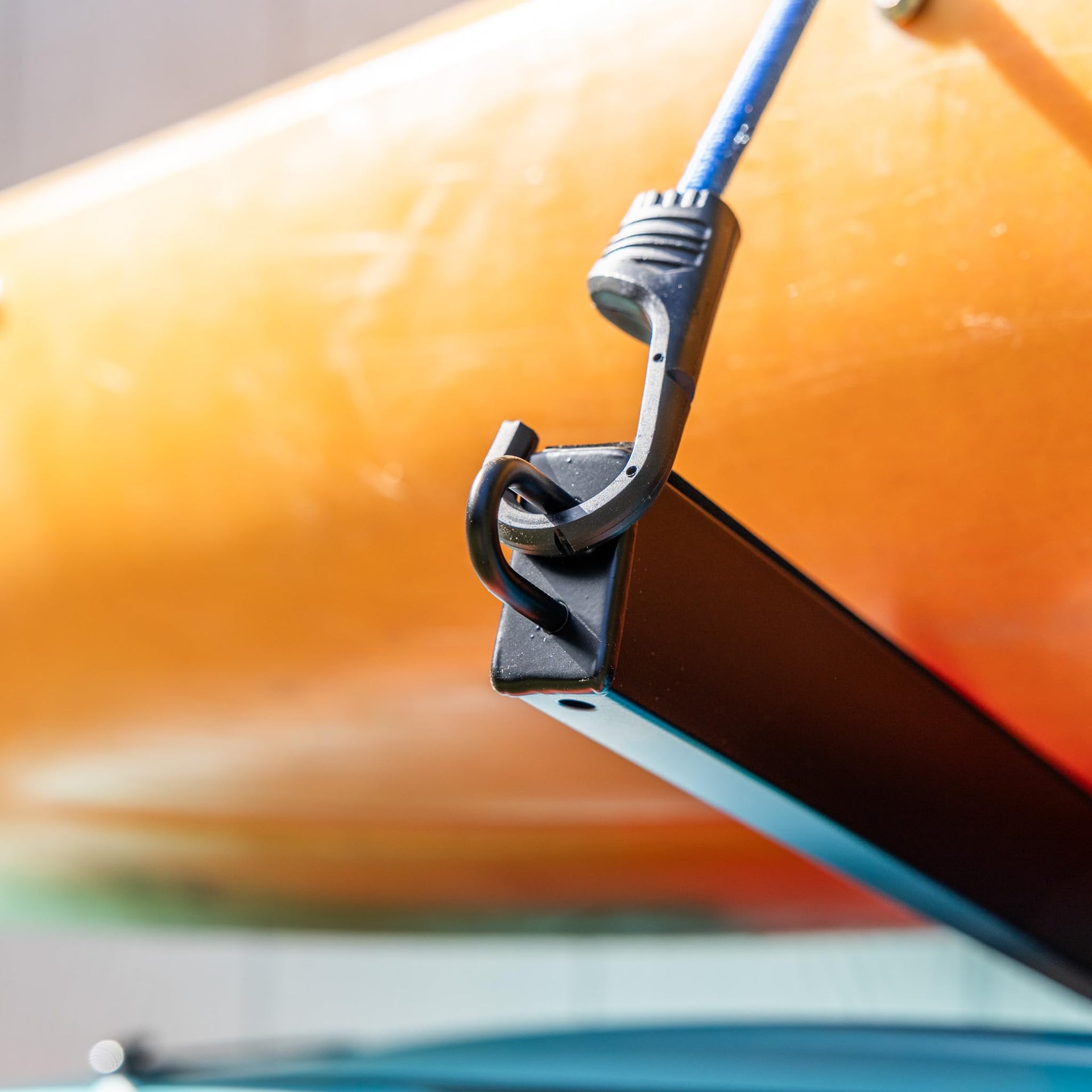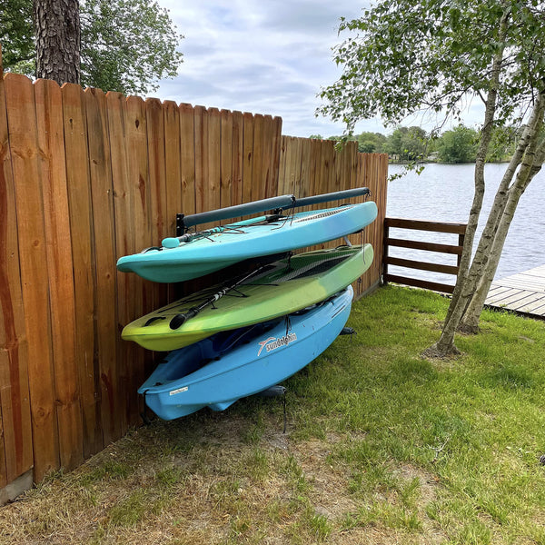 The Outdoor (4) Paddleboard Storage Rack is the ideal solution to save space and secure your boards outside. Built from powder-coated steel and aluminum, this wall-mounted rack can support up to (4) SUPs, up to 400 lbs. Each level is adjustable to fit the shape and size of your paddleboards. Holds recreational paddleboards, touring padddleboards, inflatable paddleboards, flatwater paddleboards, and even fishing paddleboards. Any remaining space can also be used to rack your paddles. Durable nylon padding and stainless steel hardware are built to handle the outdoor elements. Anchor points allow you to secure your boards with tie down straps or locking cables. Get organized and have your SUPs ready to go for your next trip to the water with this outdoor storage rack.