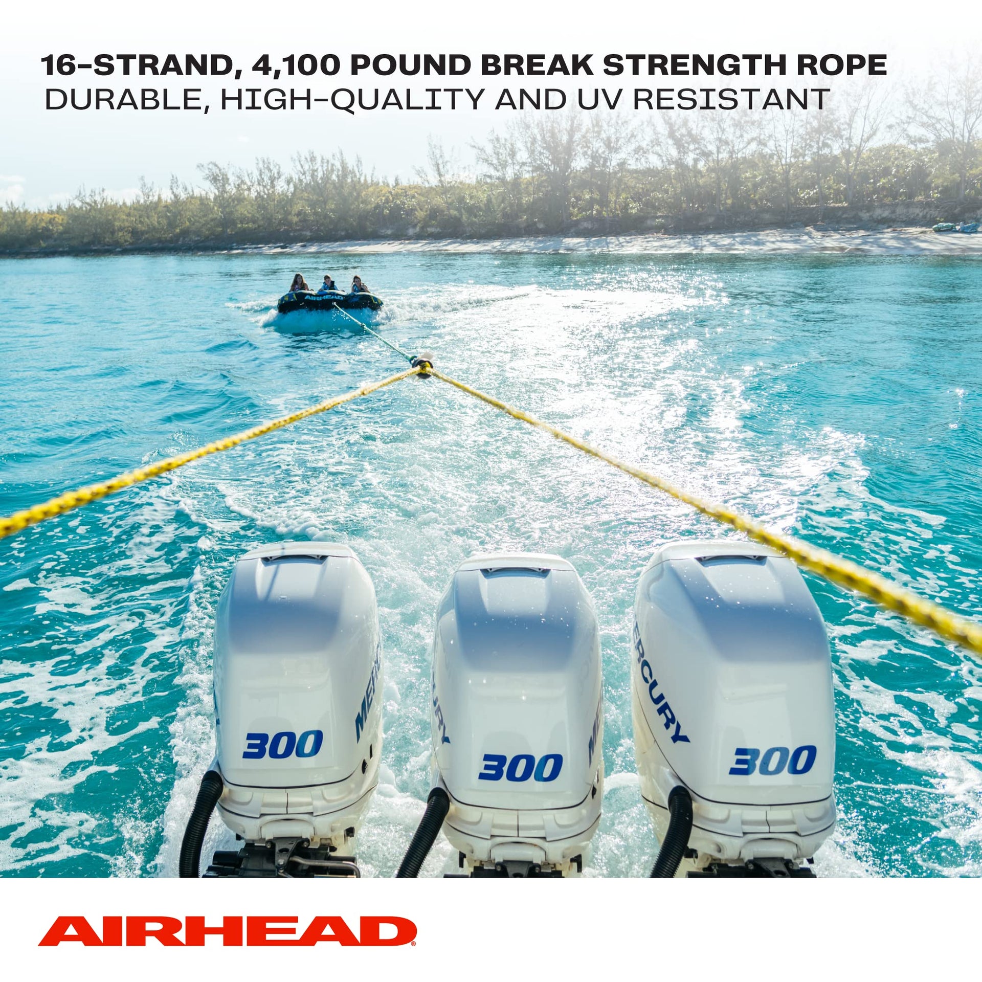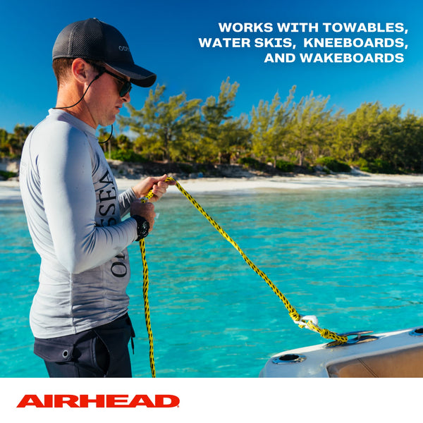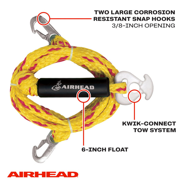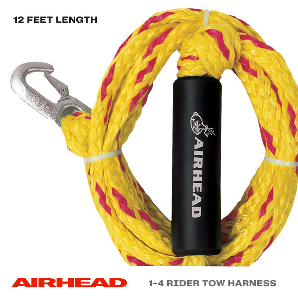 Are you looking for a tow harness to use with troublesome tow points? The 4 Person Heavy Duty Tow Harness will solve all your problems-and make tubing more efficient than ever. This tow harness is extra long and will easily stretch across wide beams. Its the perfect accompaniment for 4 person towable tubes, but also works with water skis, wakesurf boards, and wakeboards, making it great for the whole family and all the activities you love. Simply clip it onto your boat and attach your ski, board, or tube rope to the heavy duty Kwik-Connect system. With a break strength of 4,100 pounds, this is the go-to harness you need for large towable water tubes. The 6 float ensures that the Kwik-Connect stays above water, away from your propeller. At 12-feet long, it is the perfect fit for a pontoon and larger boats.