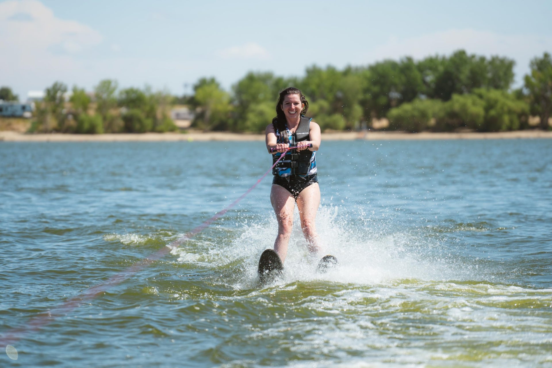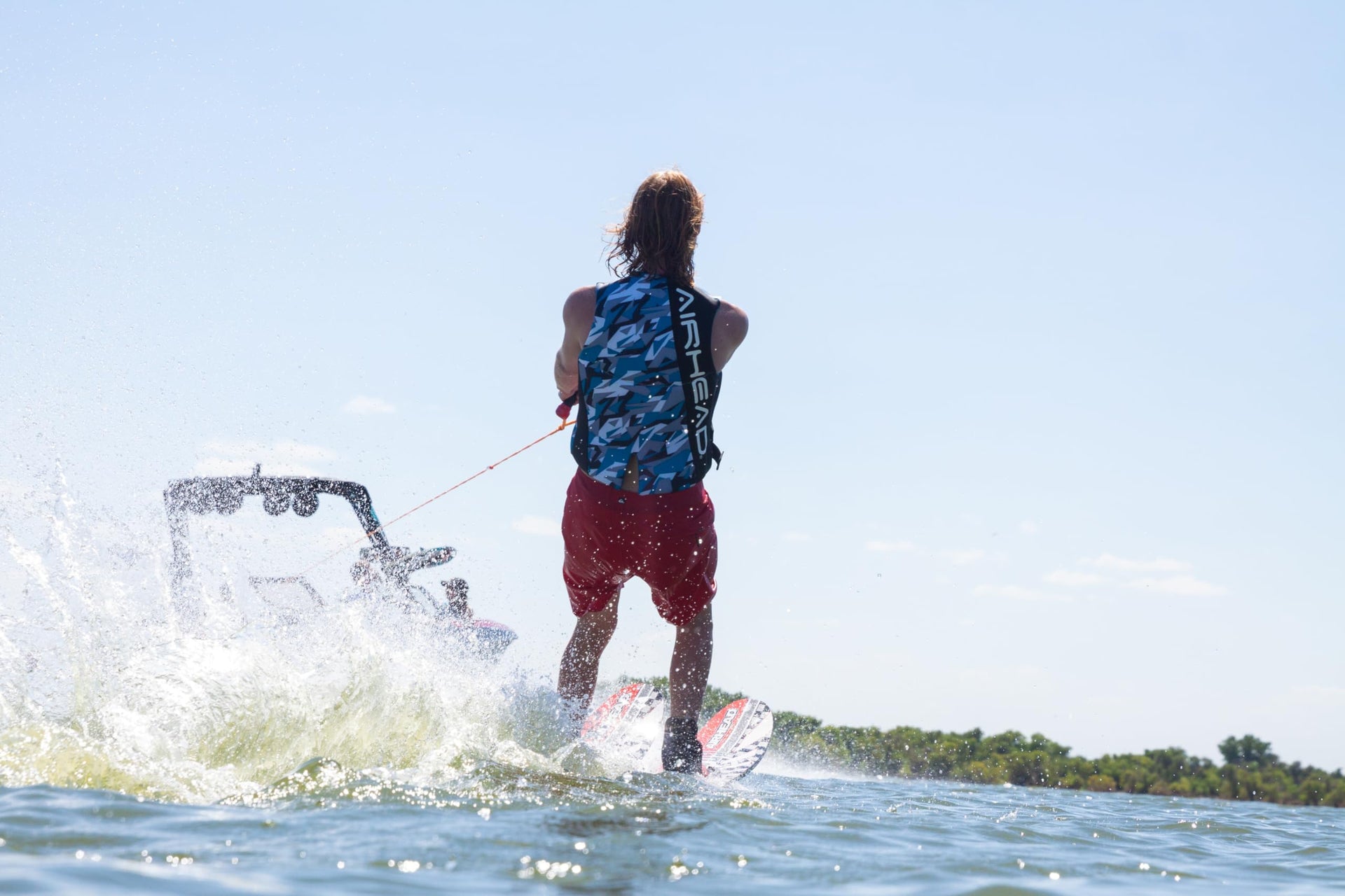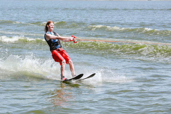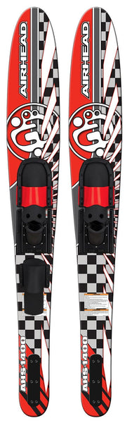 AHS-1400 Combo Wide body Water Skis You will love the stability and support of these 65.5'' long wide-body skis. The extra wide tip displaces more water for easy start-ups and provides superior stability on top of the water. The hourglass shape provides quick low effort turning initiation even at slower boat speeds. More advanced skiers will enjoy the wide tips for jumping wakes. Fiberglass reinforced fins for precise tracking. Dual density slide-type adjustable bindings fit US sizes 5-12.