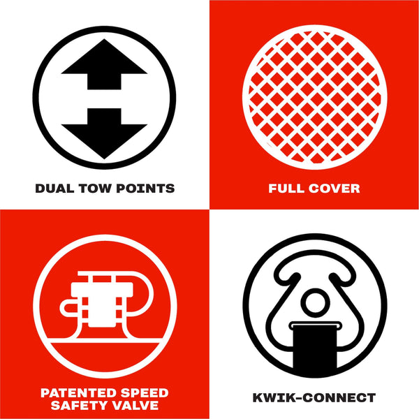 Super Mable is a 3 person towable tube that adds even more to the design we all know and adore. Discover all the classic features that Airhead tube lovers expect from the Big Mable-including a supportive backrest, top-notch safety features, foam seating pads, and dual tow points. This chariot-style towable tube holds up to three riders, making it perfect for family outings. Kids and teens will enjoy the versatility of this tube, which can be ridden two different ways, and 16 foam-filled handles keep riders safe and secure. The bright orange color and racing-inspired design turns heads and inspires both speed and thrills. Plus, the Kwik-Connect tow point makes it easy to attach and detach at a moments notice. This large water tube doubles as a floating lounger, so you can kick back and relax after a long day of excitement. Super Mable is one of the most sought-after tubes available, and the Heavy gauge PVC bladder and full nylon cover ensures fun and enjoyment for years to come.