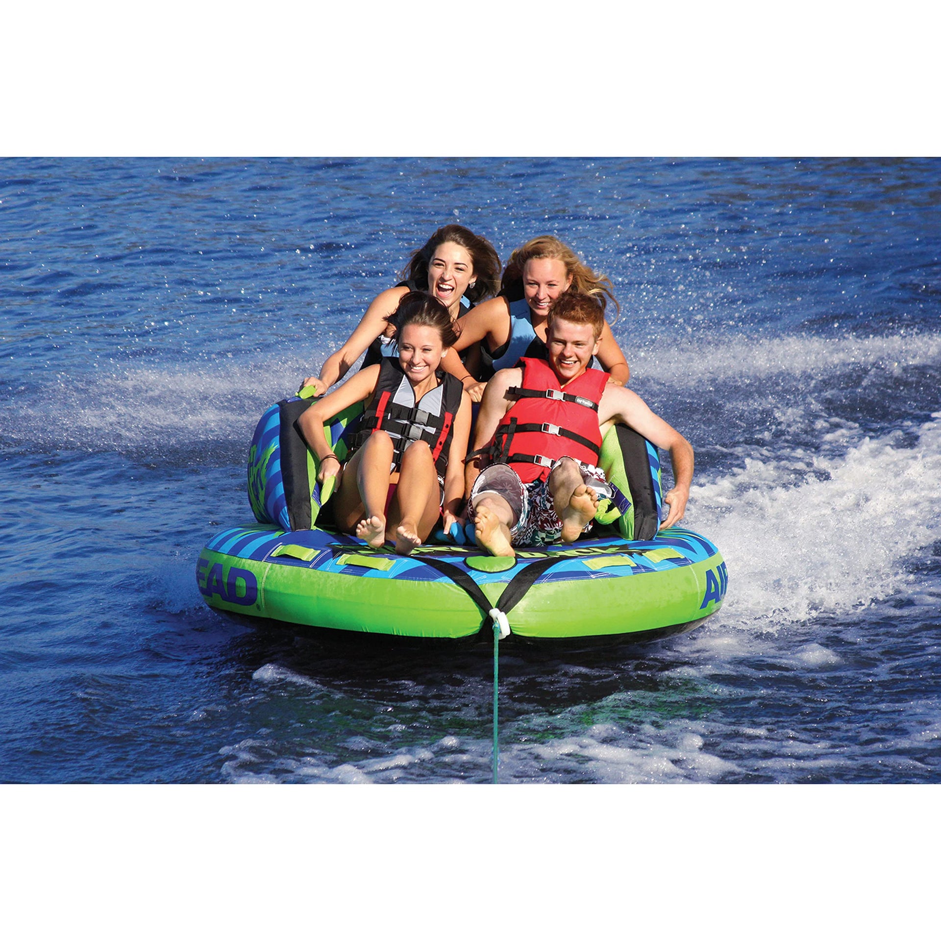 AIRHEAD SWITCHBACK is a new and exciting 4 rider towable. Two riders sit in front with a comfortable inflatable backrest and side panels to keep them in place. The other 2 riders kneel behind them, riding chariot style. It's a totally different sensation riding in front or back, so it's like 2 tubes in 1, consequently the name SWITCHBACK. This deluxe towable slides effortlessly across the wake. There are plenty of boarding straps for re-boarding from the water. SWITCHBACK features 2 heavy gauge PVC bladders and a rugged double stitched nylon cover to ensure long service. Inflation and deflation is easy with the two patented Speed Safety Valves. Size: 88 in. x 70 in. (deflated).