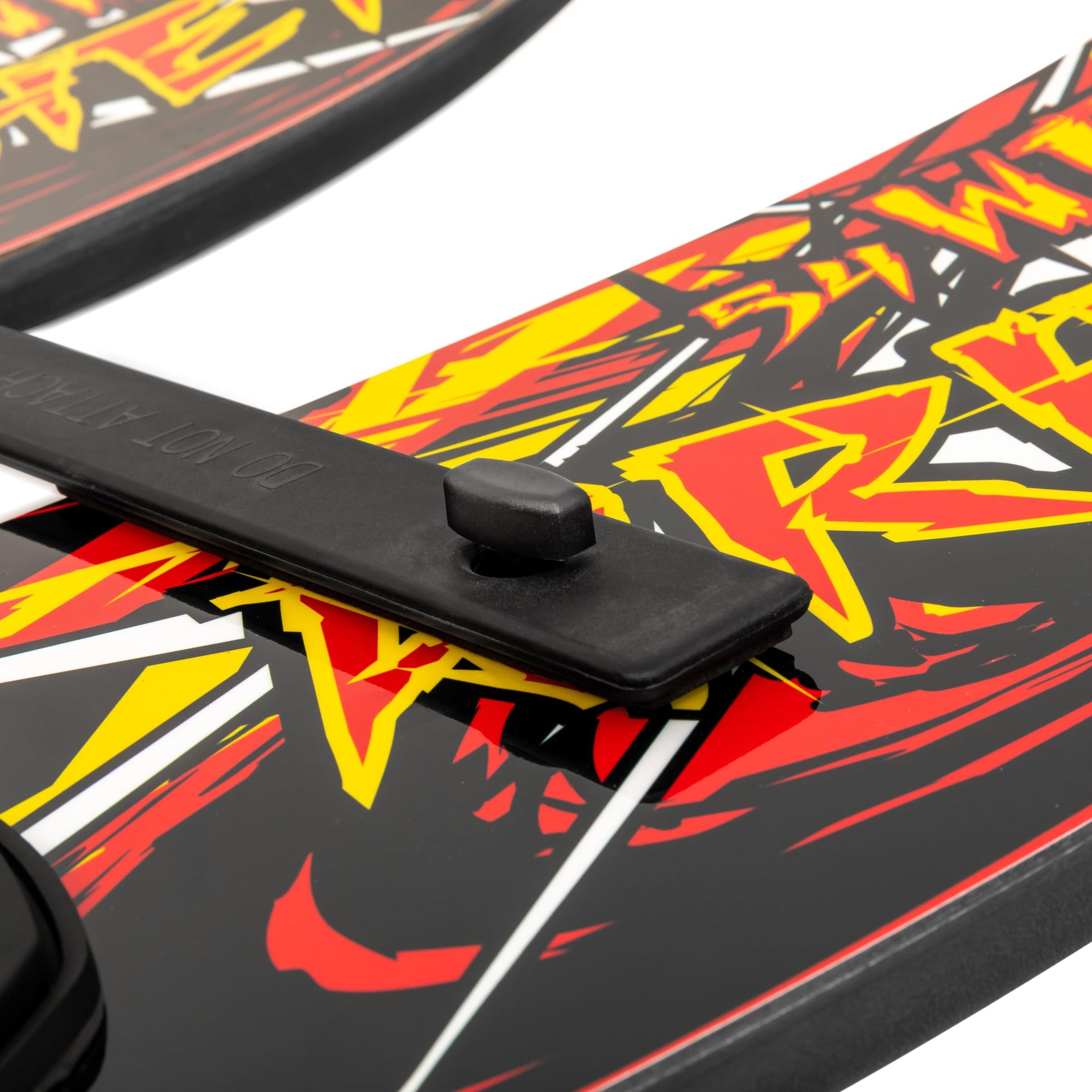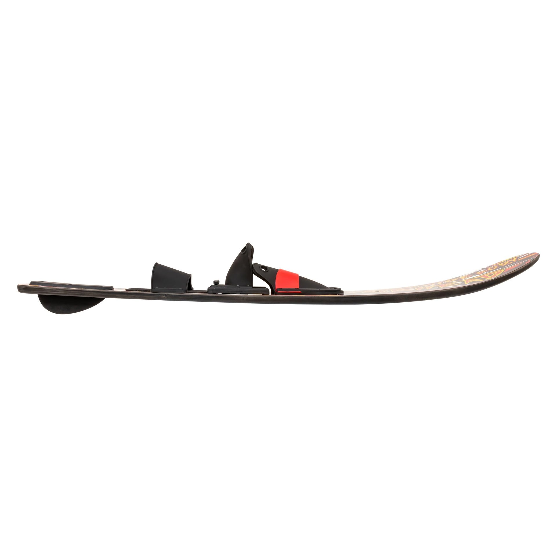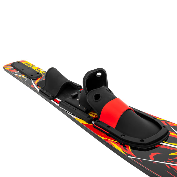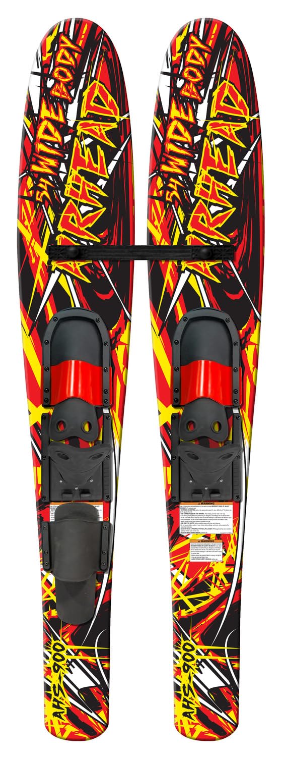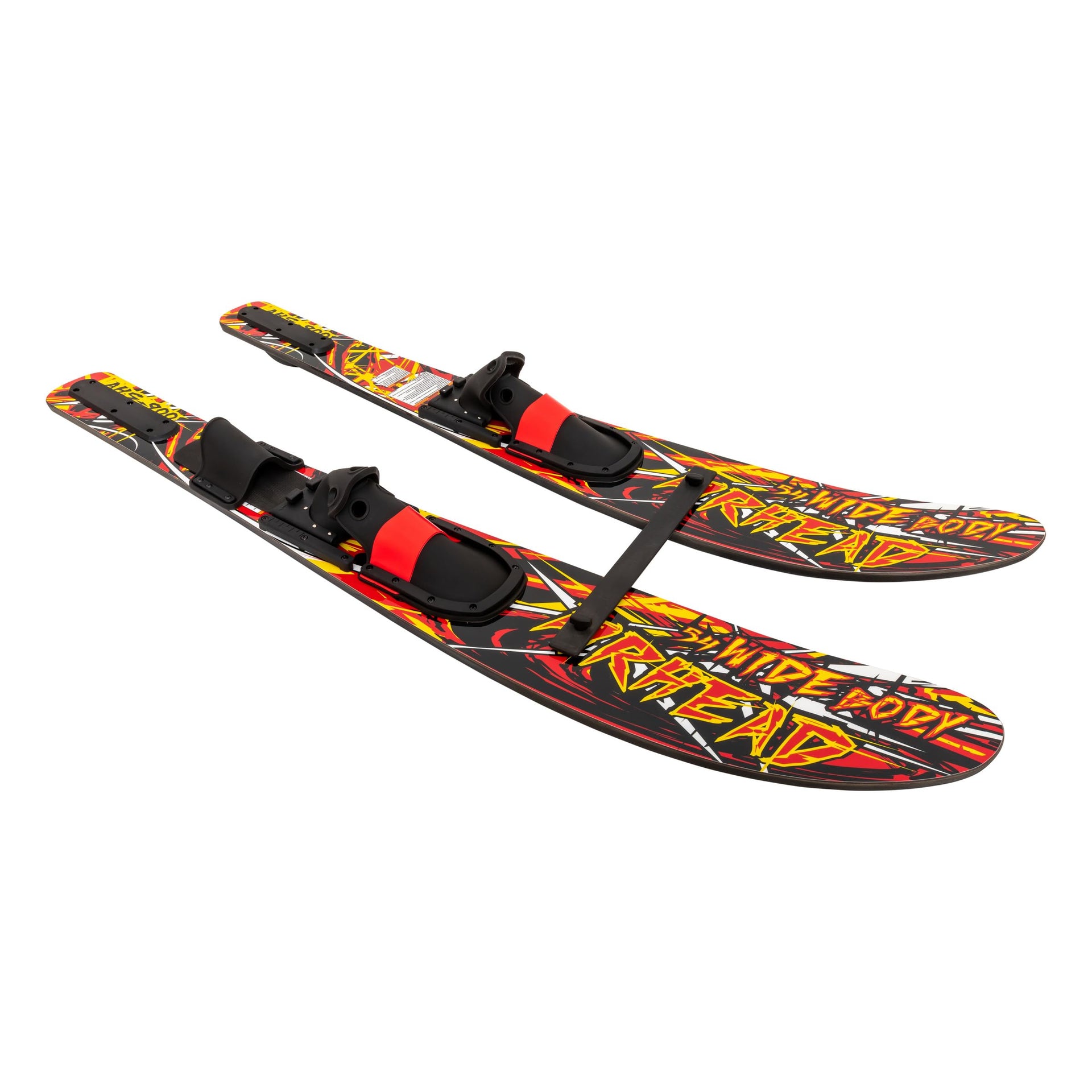 Wide Body Water Skis. These 54 inch wide body combo water skis are perfect for teaching kids and teens to deep water start, stand up, turn and drop a ski to slalom. No plowing through the water on these wide boys, they pop out of the water effortlessly. Once you get more proficient, the wide tips are excellent for jumping wakes. A removable cross bar is provided for first timers. The dual density bindings are adjustable from US sizes 2 to 9. Durable composite / foam core construction. Fiberglass reinforced nylon fins for tracking.