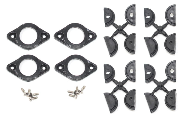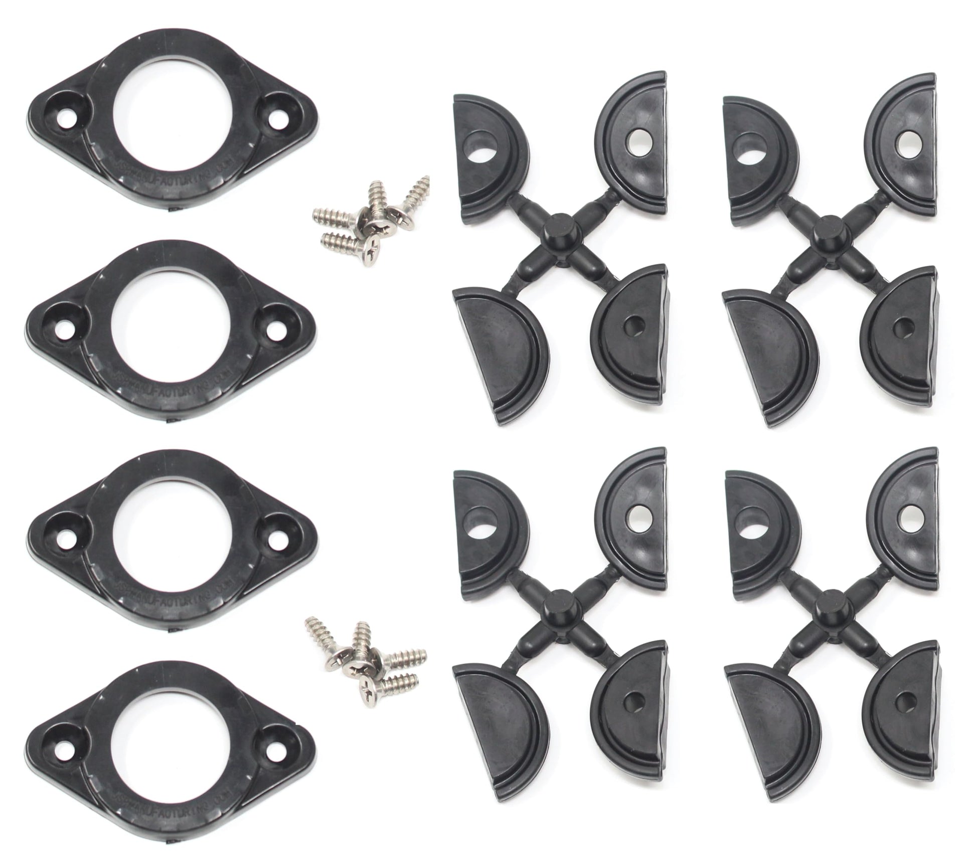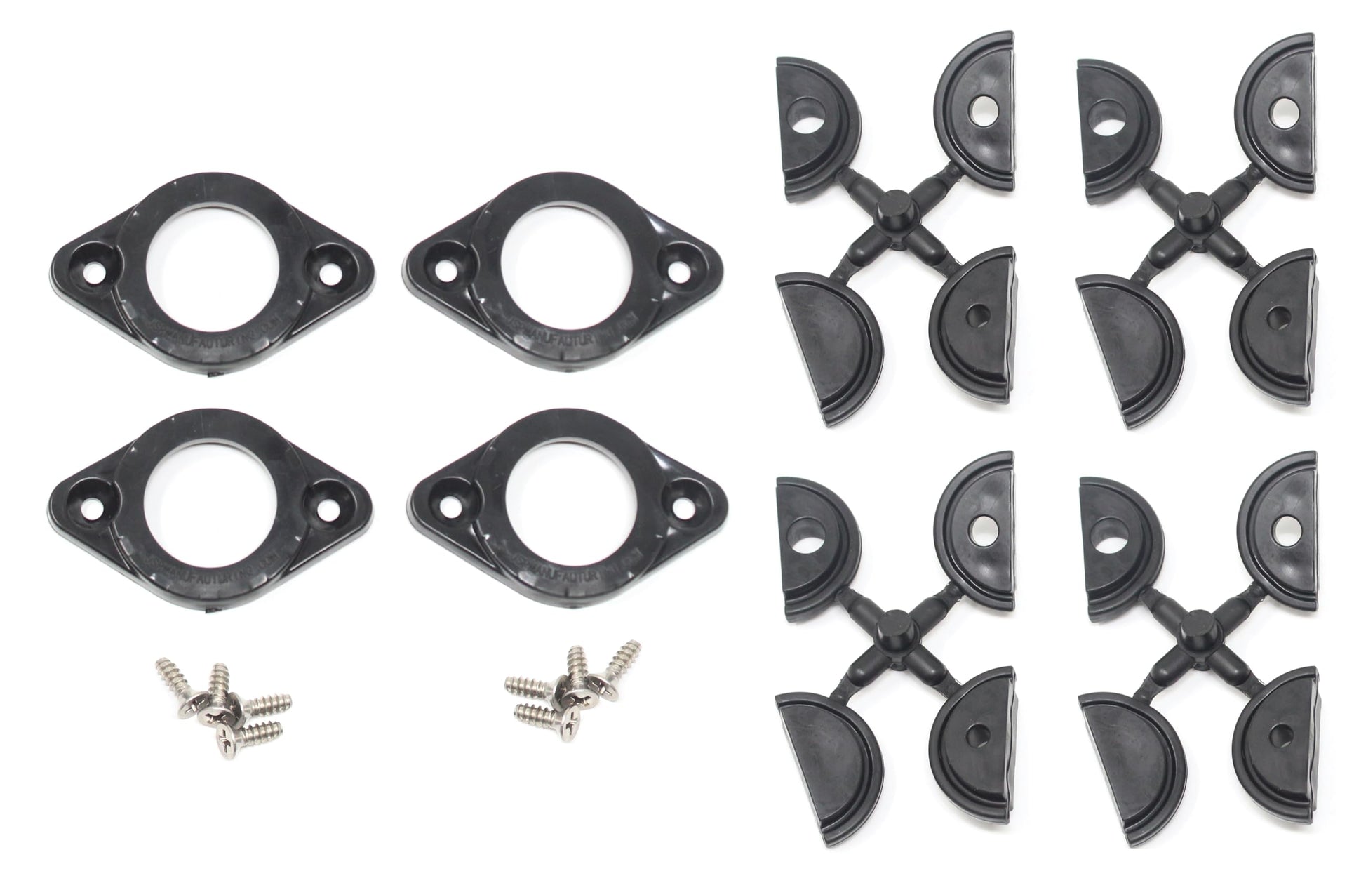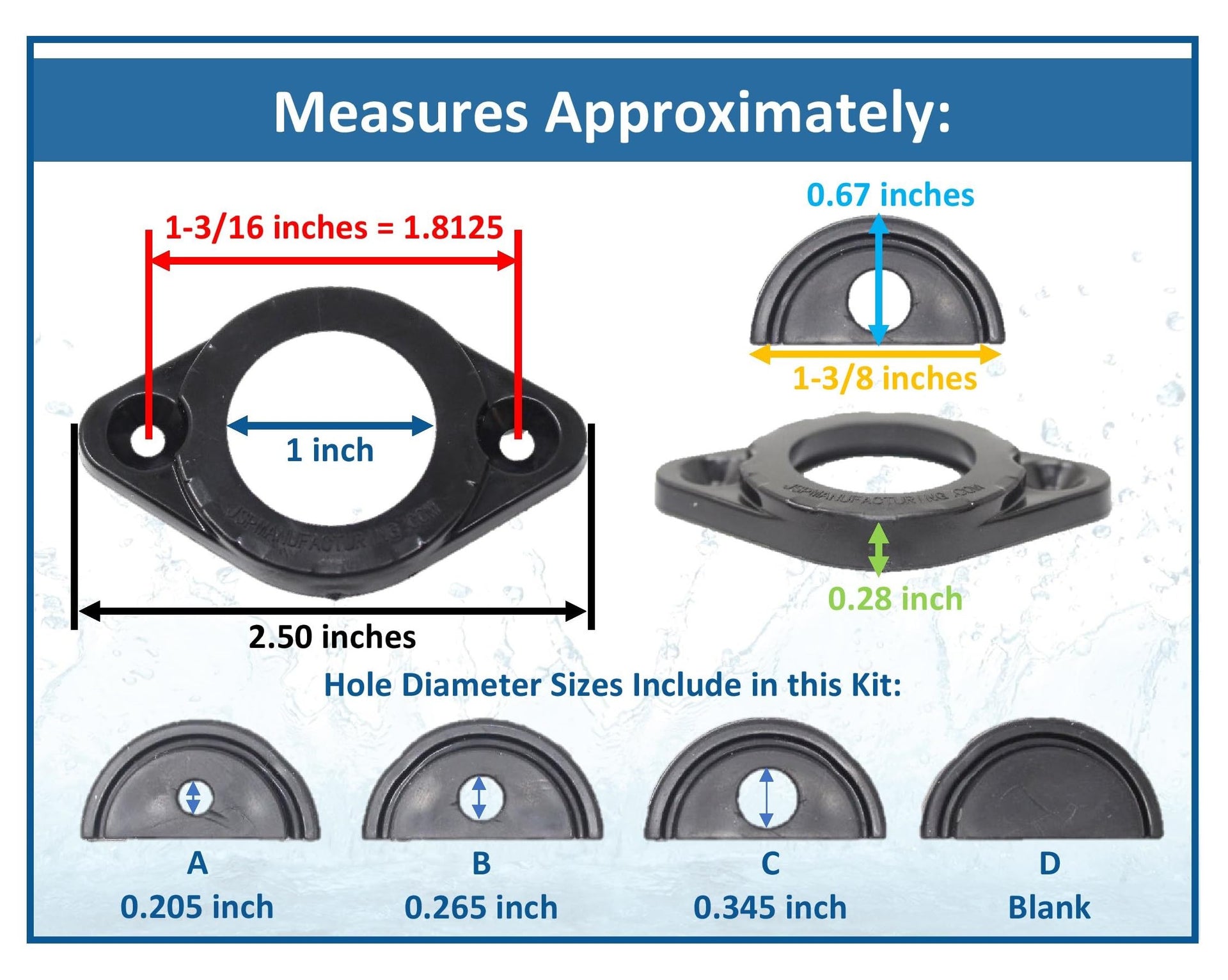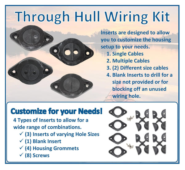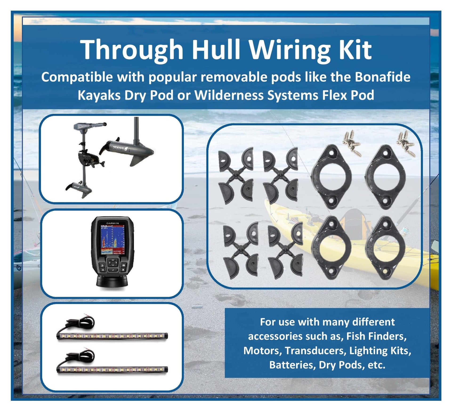 JSP Manufacturing Aftermarket Kayak Through Hull Wiring Kit This Aftermarket Kayak Through Hull Wiring Kit is perfect to clean up your wiring setup in your kayak or boat. This kit is a must have when installing motors, lighting kits, fish finders or anything where wiring needs to pass through the hull or removable dry pods of your kayak or boat. New Aftermarket Kayak Through Hull Wiring Kit Compatible with popular removable pods like the Bonafide Kayaks Dry Pod or Wilderness Systems Flex Pod. High-quality, heavy duty, marine grade materials Helps to reduce clutter and keep a clean appearance by hiding your cables inside your hull Inserts are designed to allow you to customize the housing setup to your needs, such as allowing for a single or multiple wires or varying cable sizes or using the blank inserts to drill a different hole size than provided or to block off old wiring holes. Exact items are pictured Color: Black Quantities: 1 kit Made in USA! Kit Includes: (4) Housing Grommets (12) Rubber Inserts - with Common Hole sizes (4) Blank Rubber Inserts (8) Screws Brand: JSP Manufacturing MPN: PS-KAYAK-EMS Measures Approximately: see images Grommet Length: 2.50 inches Width: 1.56 inches Height: 0.28 inches Inner Diameter: 1 inch Distance between Screw Holes (on center): 1.8125'' or 1-3/16 inches Inserts: Length: 1.375'' or 1-3/8 inches Width: 0.67 inches Hole A Diameter: 0.205 inches Hole B Diameter: 0.265 inches Hole C Diameter: 0.345 inches Aftermarket Part fits the following: For use with many different accessories such as, Fish Finders, Motors, Transducers, Lighting Kits, Batteries, Dry Pods, etc. Suitable for most styles of kayaks, boats and yachts. Compatible with popular removable pods like the Bonafide Kayaks Dry Pod or Wilderness Systems Flex Pod.