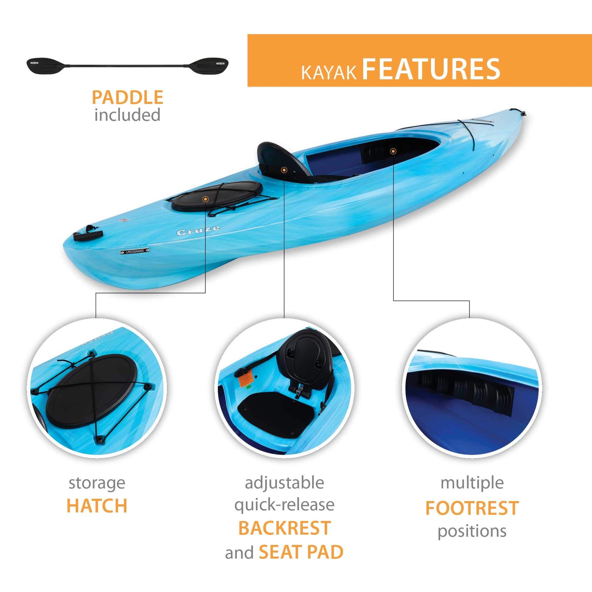 Whether you are taking a quick weekend trip to a quiet, mountain lake or a longer vacation trip to the beach with your family, The Lifetime Cruze is a great option to get you out on the water. The Lifetime Cruze Kayak is a 10-foot sit-in kayak built for comfort and performance. It comes with an adjustable seat and seat pad that maximizes your comfort while paddling. The oval storage hatch provides extra space for your gear while on the water. The rear toggle handles and molded-in side handles make it easy to carry your kayak to and from the water. The Lifetime Cruze is the ideal entry level kayak to accompany you on your next adventure. This is a 10 ft. SIS Kayak with a seat pad, hard seatback, storage hatch with shock-cords, drain plug, front and rear handle. 5-year limited warranty.