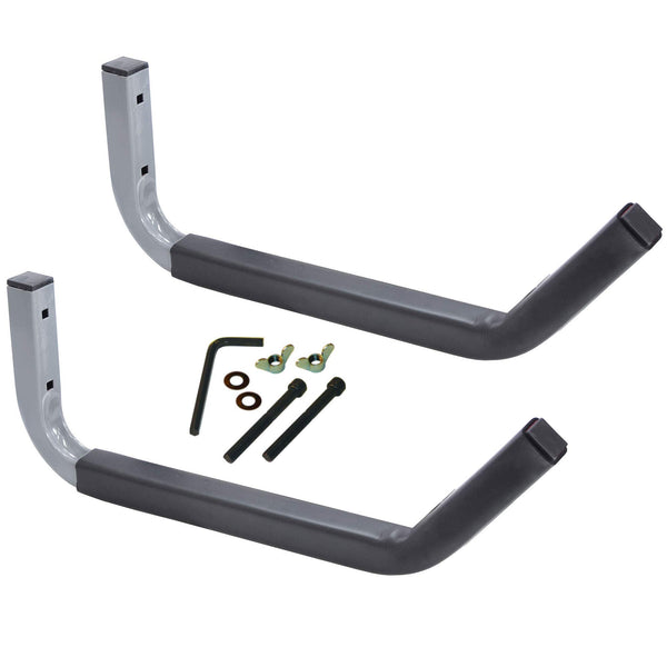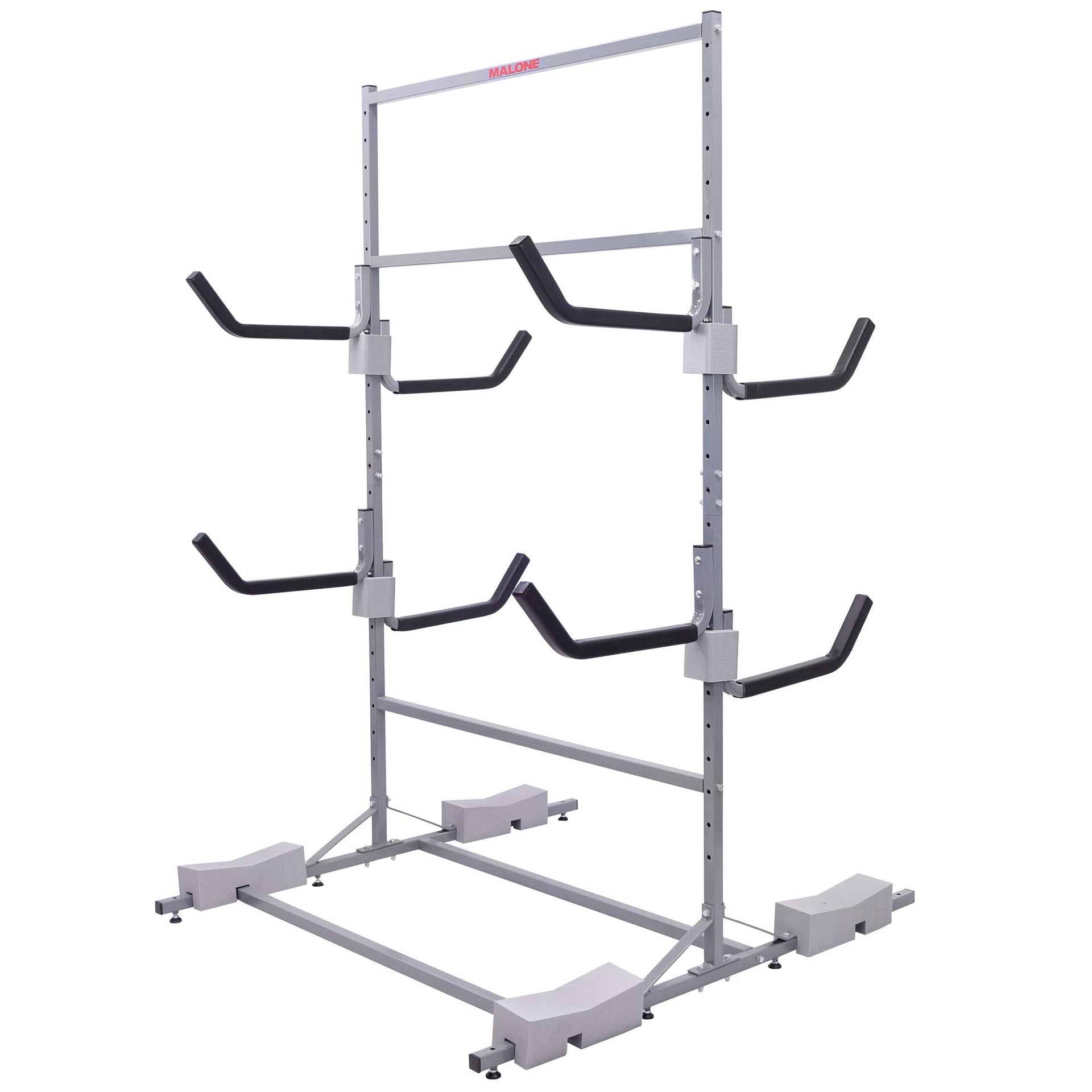 Powder coated for indoor or outdoor kayak storage | Includes 4 sets of steel padded J-Style holders and 2 sets of foam stacker blocks to protect your kayak | Eight frame levelers for perfect placement | 6 boat storage - 500 pound load capacity | Lifetime warranty