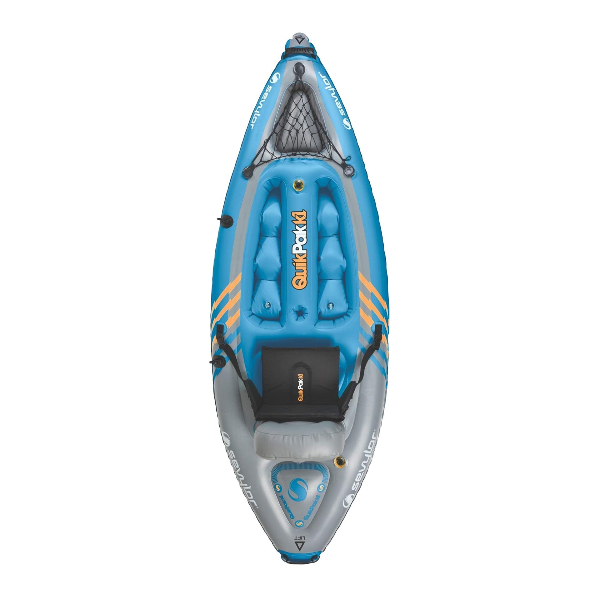 Get closer to the water and all the beauty swimming in it when you explore in a Sevylor K1 Sit-On-Top QuikPak Kayak. This inflatable watercraft works just like a traditional sit-on-top kayak, except when you're ready to pack up, it folds up into its integrated backpack with padded shoulder straps and fits inside any car or truck-and it all sets up within five minutes. While you're in the water, you'll paddle in more comfort with a design that allows you to stretch your legs, back and arms more easily. Pack food and gear in the cargo net on the front, and keep your drink close in the cup holder. You'll easily carry the kayak over shallow water and in and out of the water with the lift handle. The rigid floor, flat bottom and three-chamber design keep the boat's solid shape on the water and offer added security if you get snagged. The thick PVC and reinforced bottom are part of the Airtight System that. and the Double Lock Fast Valves and Mini Double Lock Fast Valves makes quick work of inflation and deflation. The 8 ft. 7 in. x 3 ft. (2.62 m x.91 m) kayak holds up to 400 lbs. (181.43 kg)and includes a paddle that breaks down for compact storage and a high-pressure hand pump.