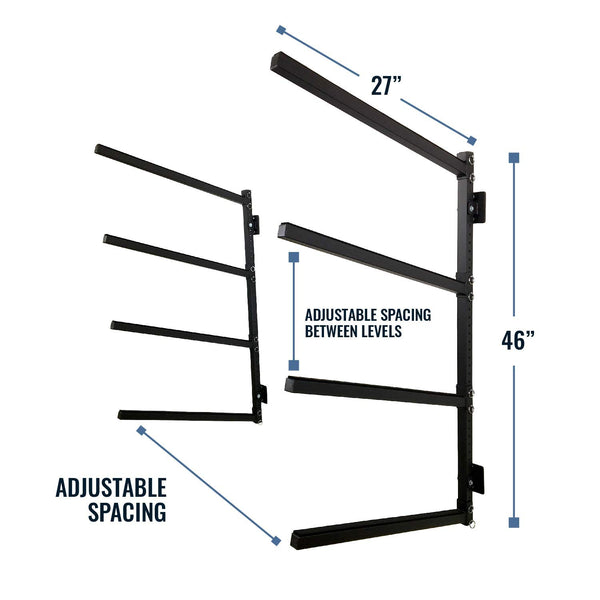 The Garage (4) Paddleboard Wall Mounted Storage Rack is the ideal solution to save space and secure your boards. Built from powder-coated steel and aluminum, this wall-mounted rack can support up to (4) SUPs, up to 400 lbs! Each level is adjustable to fit the shape and size of your paddleboards. Holds recreational paddleboards, touring padddle boards, inflatable paddleboards, flatwater paddleboards, and even fishing paddleboards. Any remaining space can also be used to rack your paddles. Anchor points allow you to secure your boards with tie down straps or locking cables. Get organized and have your SUPs ready to go for your next trip to the water with this storage rack.
