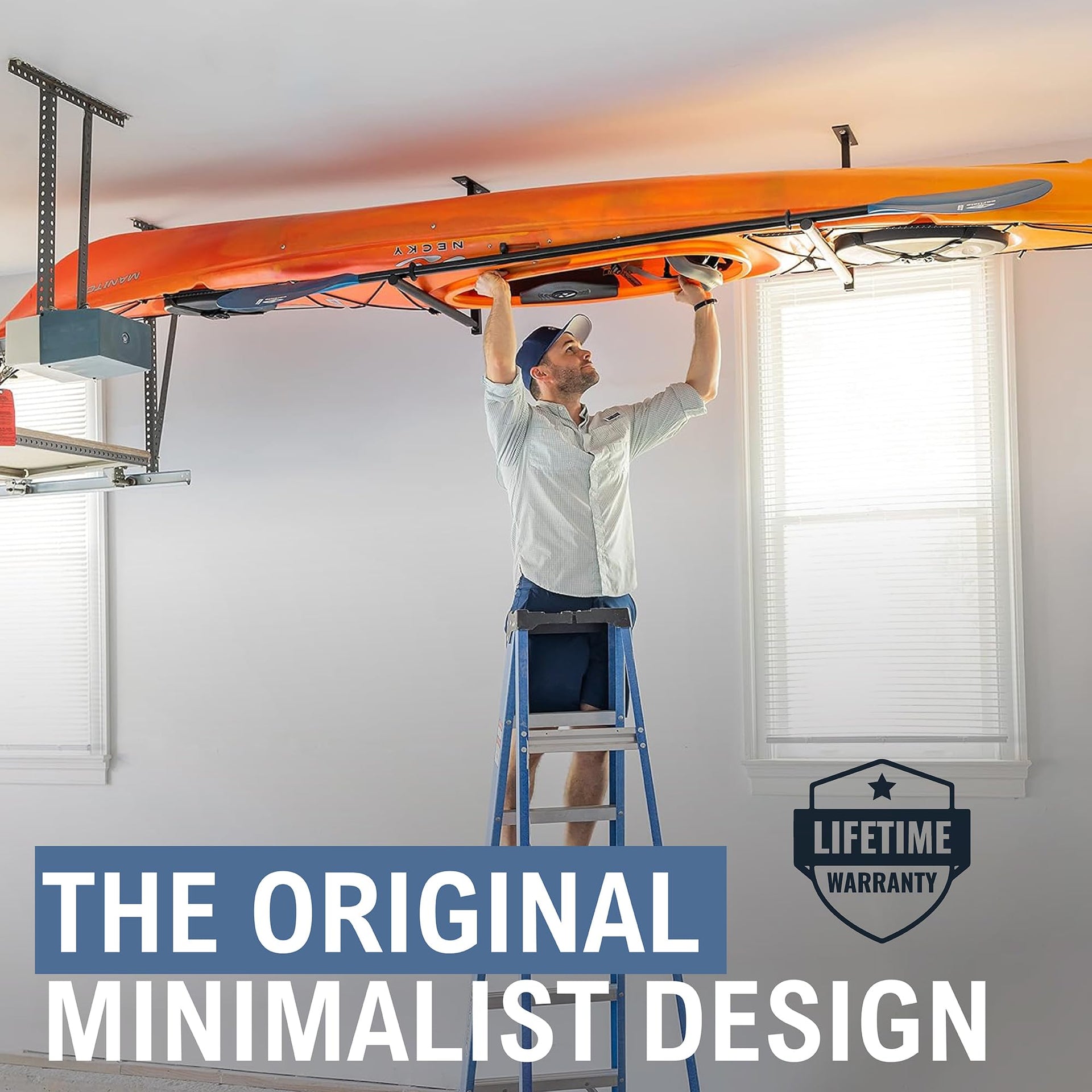 From the leaders in outdoor gear storage, StoreYourBoard, The Adjustable Kayak Ceiling Rack allows you to utilize overhead space in your home or garage. The single-sided rack fits one kayak within a space-efficient package. Adjustable ceiling posts expand from 10'' up to 18'' to accommodate most kayaks. Hang your recreational kayak, sit-on-top kayak, touring kayak, whitewater kayak, tandem kayak, or pedaling kayak. Solid, powder-coated steel supports kayaks up to 75 lbs. Removable, padded storage arms gently hold your boat in place without scratching. Clear up floor space and protect your kayak with this easy to use kayak ceiling rack!