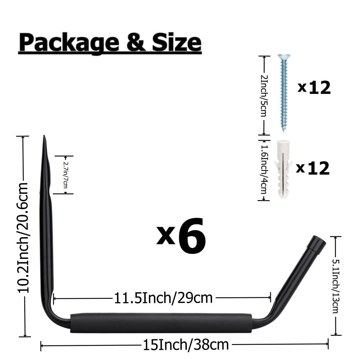 6 pack large garage hook is perfect for hanging kayak, ladder, bicycle, garden hose, sport equipment and other heavy duty objects. You can wall mount it in the garage, shop, basement, shed, kitchen, bathroom, utility room for efficient storage. ?Strong and Efficient Garage Hangers - Guaranteed! ?6 pack garage organizer hooks ?Our heavy duty garage hanger is the ideal wall mounting solution for kayak, extension ladders, garden hoses, bikes, tools and other bulky items ?Our garage ladder hook works on hardwood, studded walls, block and brick ?Made from heavy duty iron and PVC materials ?Easy to install,make a small mark where the center of the screw will go, and drill a hole in the spot(s) you marked. Make sure the hole you drill is deeper than the anchors length.Then insert the drywall anchors into the hole.Lastly, screw the bolt by using a screwdriver. Specification: Including: 6 Hooks 12 Screws 12 Anchors(Wall Plugs) Material: Steel Capacity: 50 LBS(Middle Part), 40LBS(End Part ) Size: Garage Rack: 15 inches(L) x 10.2 inches(H) Screws: 2 inches(length) Anchors: 1.5 inches(length) MONEY BACK GUARANTEE: We think you're going to love this heavy duty garage utility hooks as much as we do. But in case you don't, just return it within 30 days for a full refund, no questions asked.