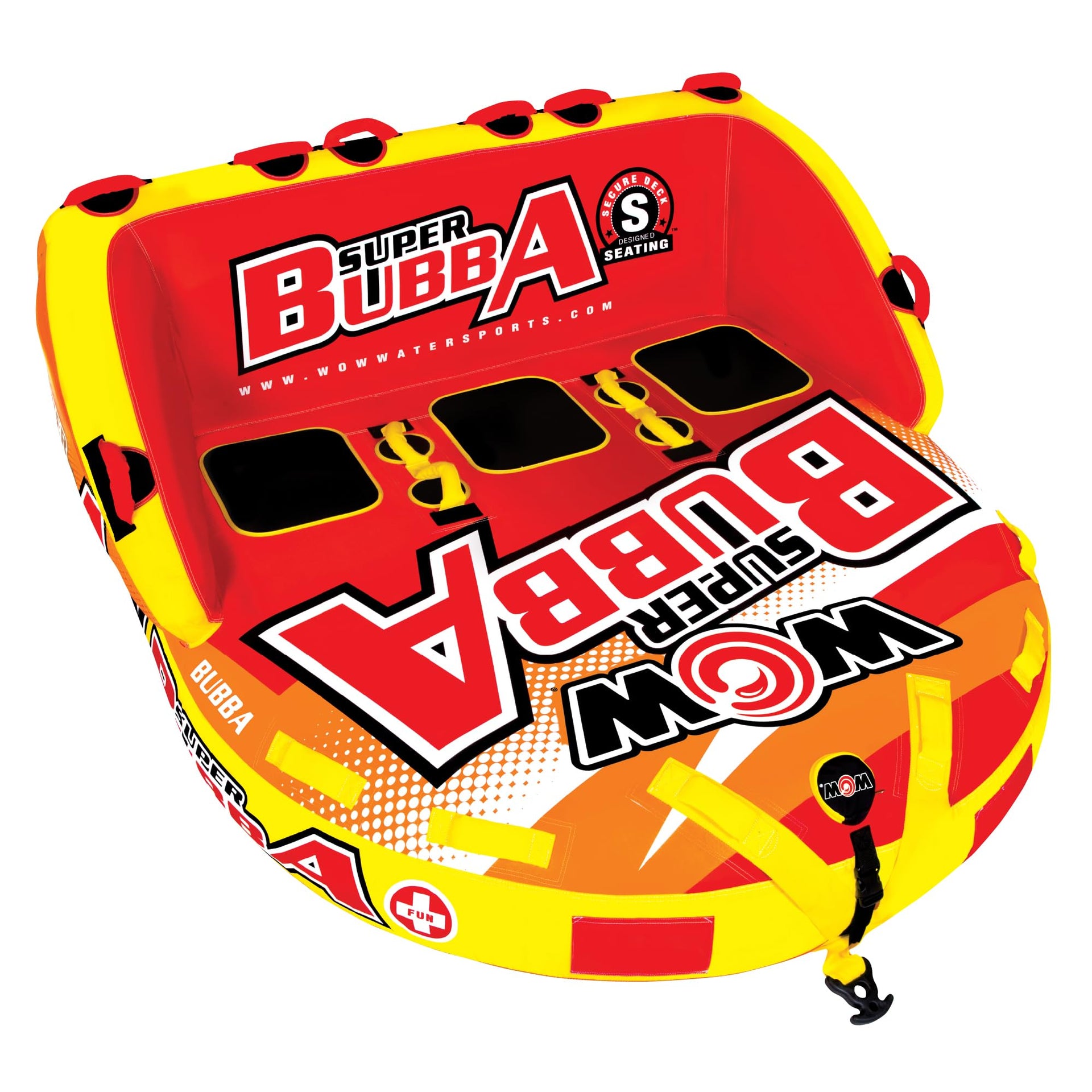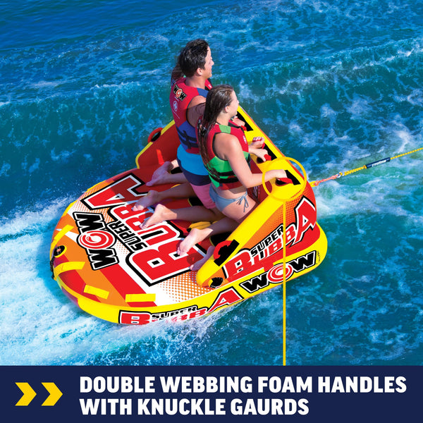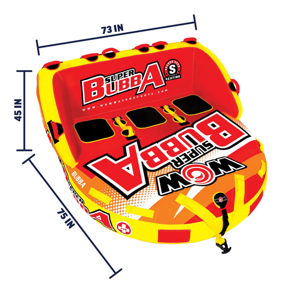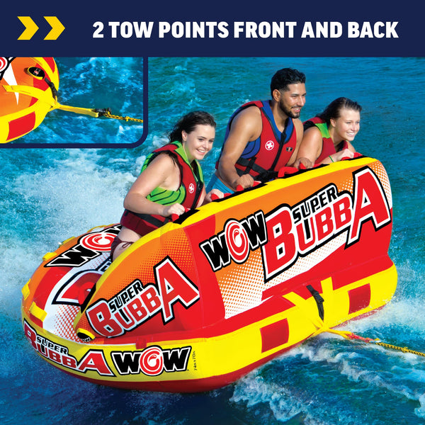 Now, ride on the waves like no ones business with the WOW Super Bubba Towable Tube for Boating for 1 - 3 Persons. A perfect tube for the family who is just getting into boat tubes and towables, but also something that anyone can have fun on. This towable tube has a maximum capacity of 510 lbs or 231 kg. The secure deck seating on the towable tube comes with a super-high backseat with sidewalls which is great for keeping your kids safe. The high backrest means it is more difficult to fly off on the wilder rides. The smooth, flat base of this boat tube will get this baby going fast on water if that is what you are looking for. It has 2 tow points - back and front, so you can ride laying, sitting down, or kneeling chariot style. After you are done with this water ski, this towable tube also makes a great float couch on the water. Relax with your friends and family while floating on your favorite water body. The boat tube is crafted with a heavy-duty PVC bladder and nylon cover to make it robust and long-lasting. It features speed valves for faster inflation and deflation. The BUBBA towable tube is backed by a 1-year warranty.