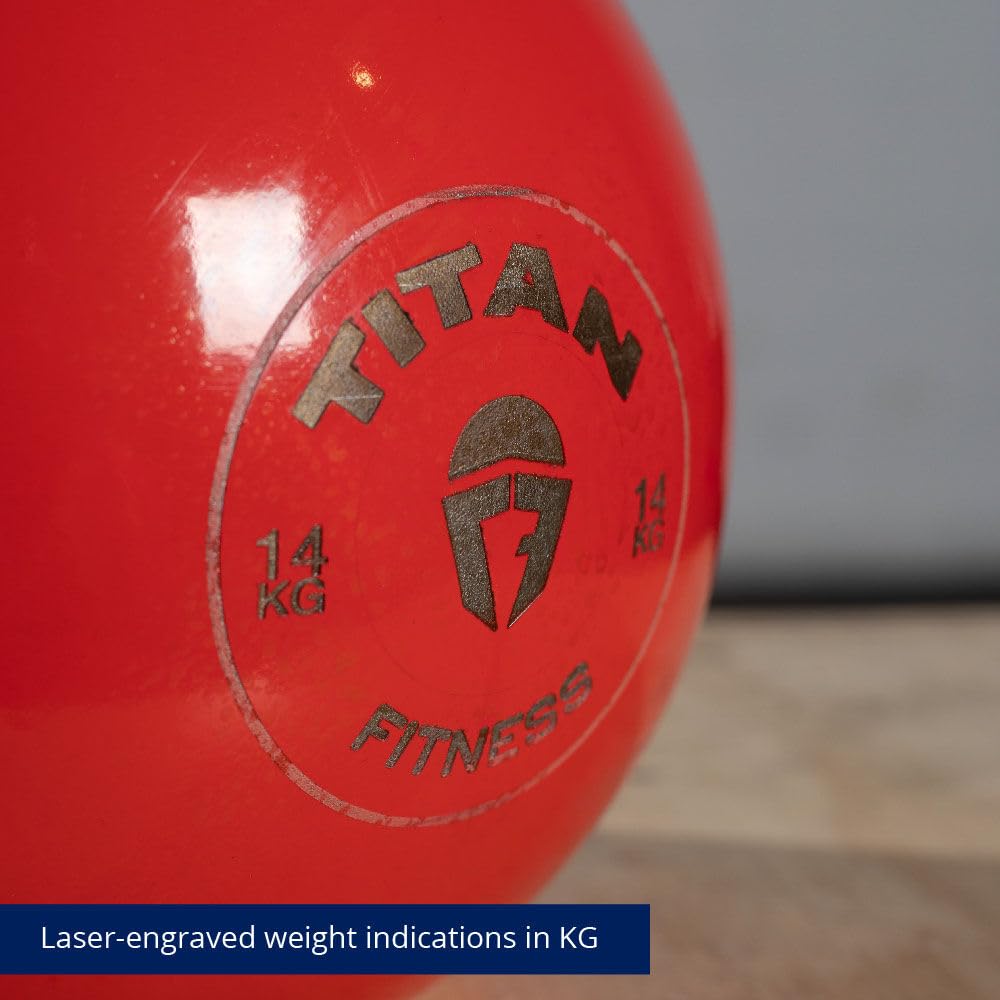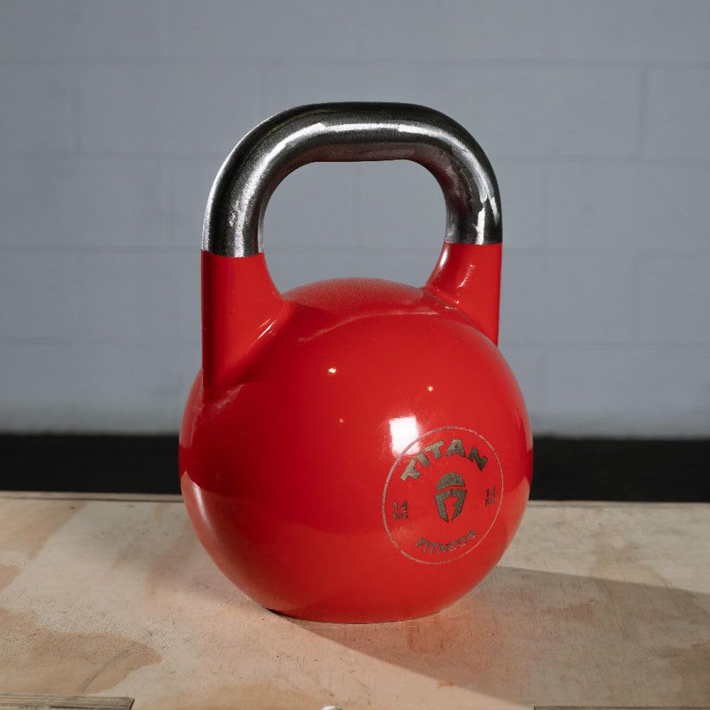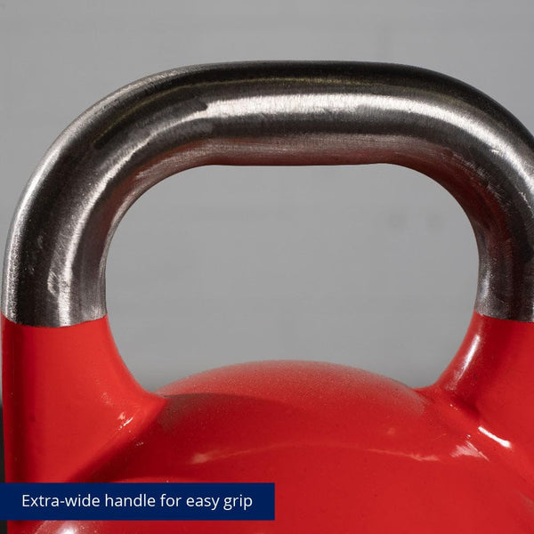 Elevate your workout with these versatile competition kettlebells. Spanning from 8 KG (18 LB) to 32 KG (70.5 LB) with laser-engraved KG weight indications, these robust steel casts allow you to adjust the weight to suit your workout routine - ideal for building overall strength, promoting calorie burn, and improving balance. Featuring a smooth wide-loop handle and a secure flat base, these kettlebells are perfect for movements like pushups that require stability. And they function as effective resistance and counterbalance for a diverse range of upper and lower-body exercises.FEATURES: - Perform swings, presses, squats, snatches, and more - Hollow core for better balance - Extra-wide handle for easy grip - Smooth finish for a great hand feel and grip while performing various exercises - Flat base for easy storage and exercises such as handstands - Laser-engraved weight indications in KG - Sold individually SPECIFICATIONS: - Overall Height: 290 mm / 11.4-in. - Overall Diameter: 210 mm / 8.3-in. - Handle Width: 190 mm / 7.48-in. - Handle Diameter: 35 mm - Finish: Red - Material: Steel - Product Weight: 14 KG / 30 lb. - Quantity: 1