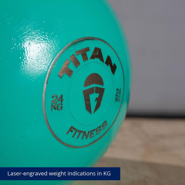 Elevate your workout with these versatile competition kettlebells. Spanning from 8 KG (18 LB) to 32 KG (70.5 LB) with laser-engraved KG weight indications, these robust steel casts allow you to adjust the weight to suit your workout routine, ideal for building overall strength, promoting calorie burn, and improving balance. Featuring a smooth wide-loop handle and a secure flat base, these kettlebells are perfect for movements like pushups that require stability. And they function as effective resistance and counterbalance for a diverse range of upper and lower-body exercises.FEATURES: - Perform swings, presses, squats, snatches, and more - Hollow core for better balance - Extra-wide handle for easy grip - Smooth finish for a great hand feel and grip while performing various exercises - Flat base for easy storage and exercises such as handstands - Laser-engraved weight indications in KG - Sold individually SPECIFICATIONS: - Overall Height: 290 mm / 11.4-in. - Overall Diameter: 210 mm / 8.3-in. - Handle Width: 190 mm / 7.48-in. - Handle Diameter: 35 mm - Finish: Teal - Material: Solid Steel - Product Weight: 24 KG / 53 lb. - Quantity: 1