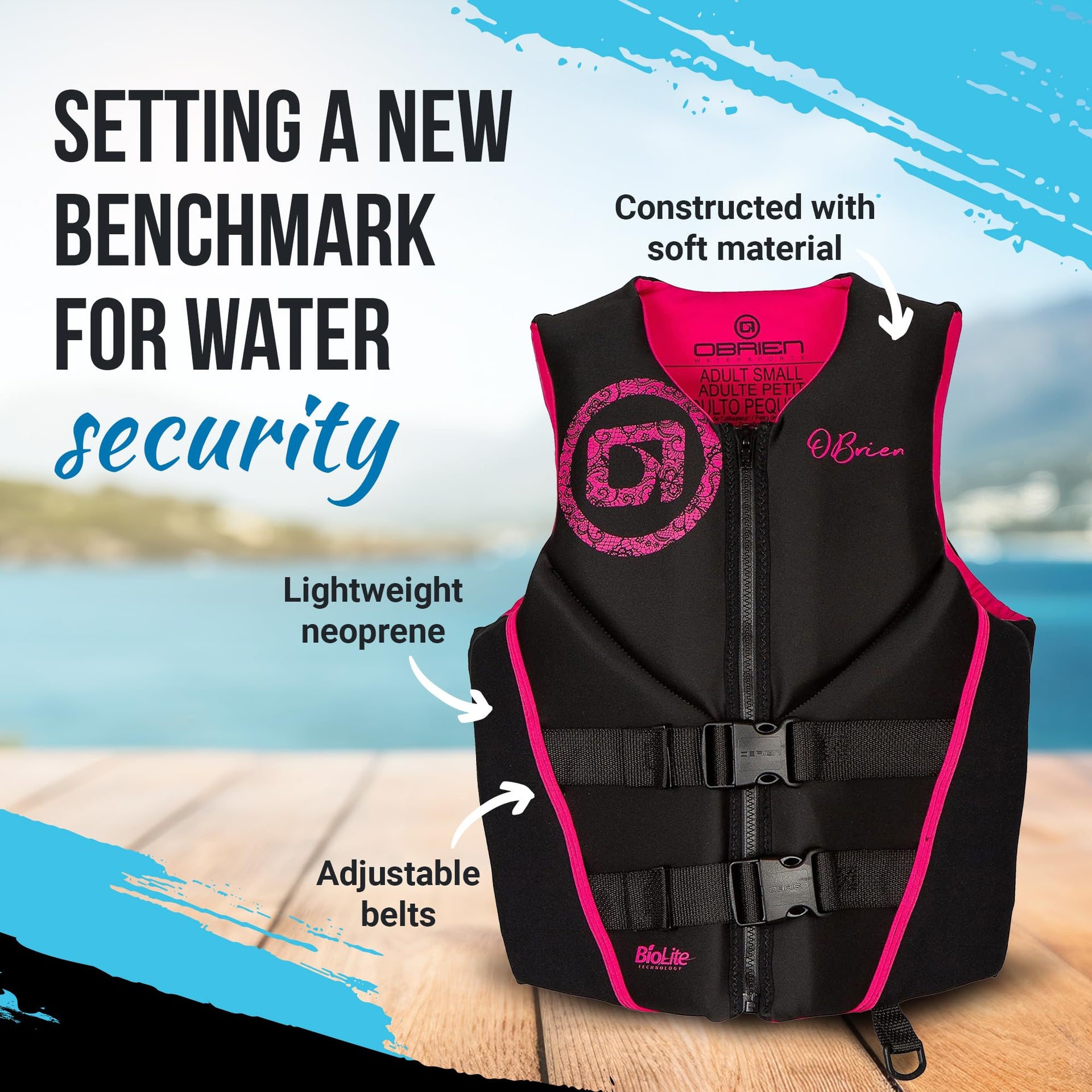 The O'Brien women's traditional life jacket is a reliable and essential piece of water safety equipment designed specifically for women. This US Coast Guard/Transport Canada Type 70 life jacket offers comfort, security, and freedom of movement, ensuring a comfortable fit for extended periods on the water. It features a durable construction with high-quality materials for safety. The jacket is equipped with two djustable straps with buckles and a front zipper to allow for a customized and secure fit for women of various body shapes and sizes. With its stylish design and vibrant colors, the O'Brien women's traditional life jacket combines both functionality and fashion, making it the ideal choice for women seeking safety and style while engaging in water activities.