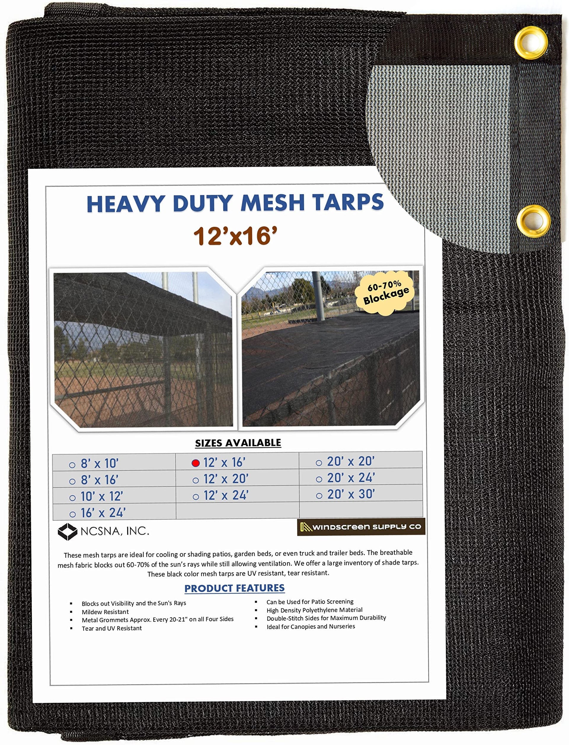 Windscreensupplyco 60-70 12 Ft X 16 Ft Mesh Tarpshade Cloth 9-Needle Knitted Heavy Duty Black With Grommets For Green House, Gar